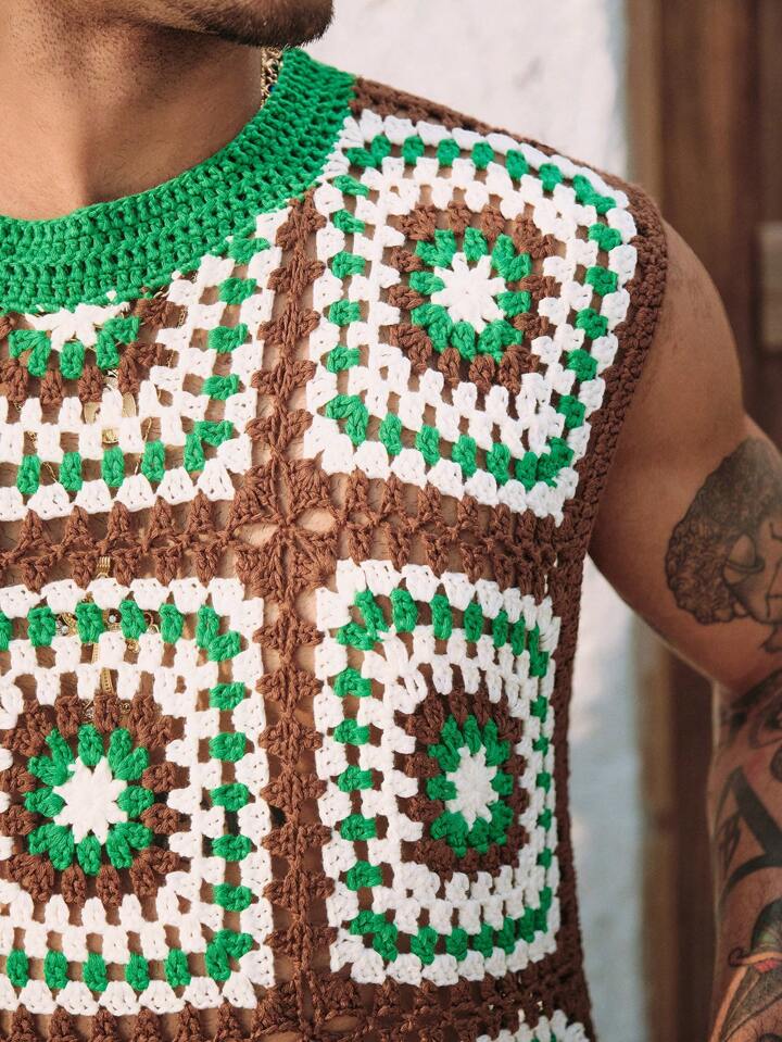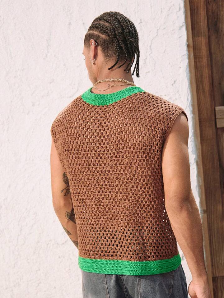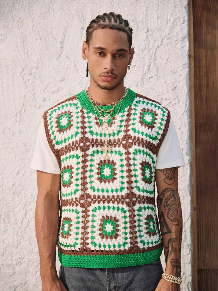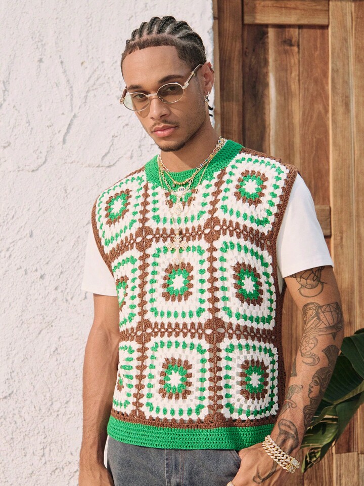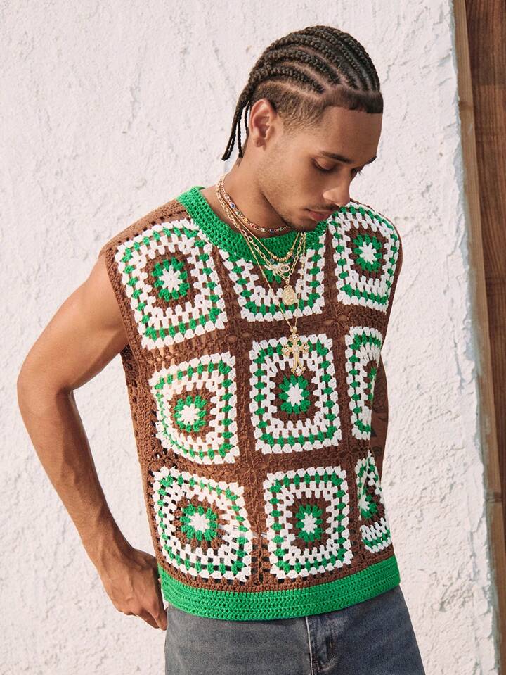 Casual Men's Crew Neck Grandma Plaid Hollow Out Vintage Knit Sweater Vest, Vacation