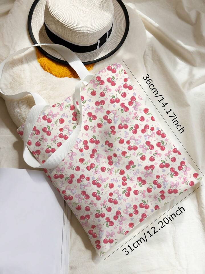 Cherry Pattern Double-Sided Printed Canvas Shoulder Bag, Tote Bag Large, Best Fall Inspo Ideas, Kawaii Cherry Elements, Literary School Bag & Bookbag For Women Or Students, Perfect For Books, Shopping, Back To School And More