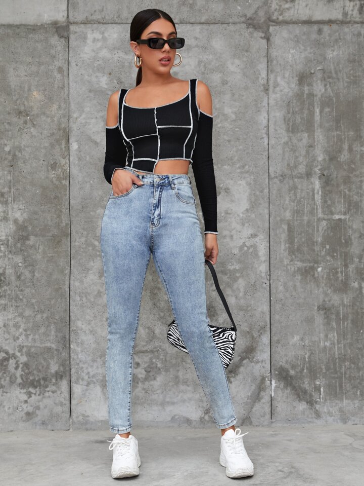 Cold Shoulder Asymmetrical Hem Contrast Stitch Top