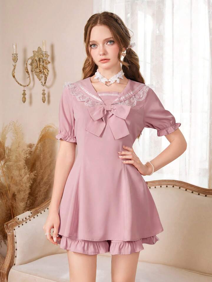 Contrast Lace Bow Front Top & Ruffle Hem Shorts
