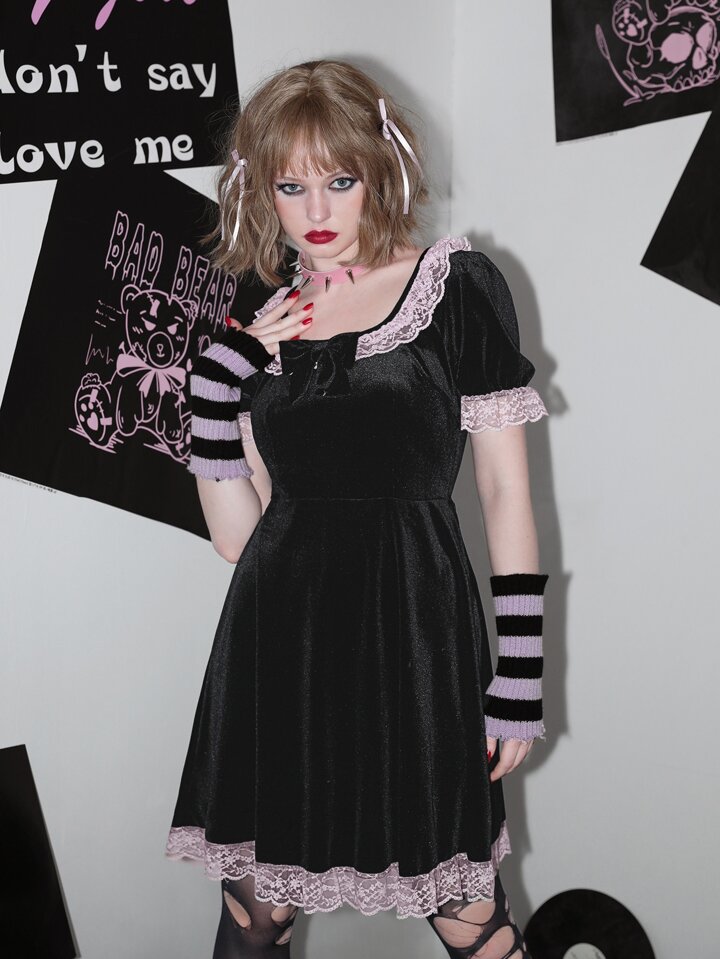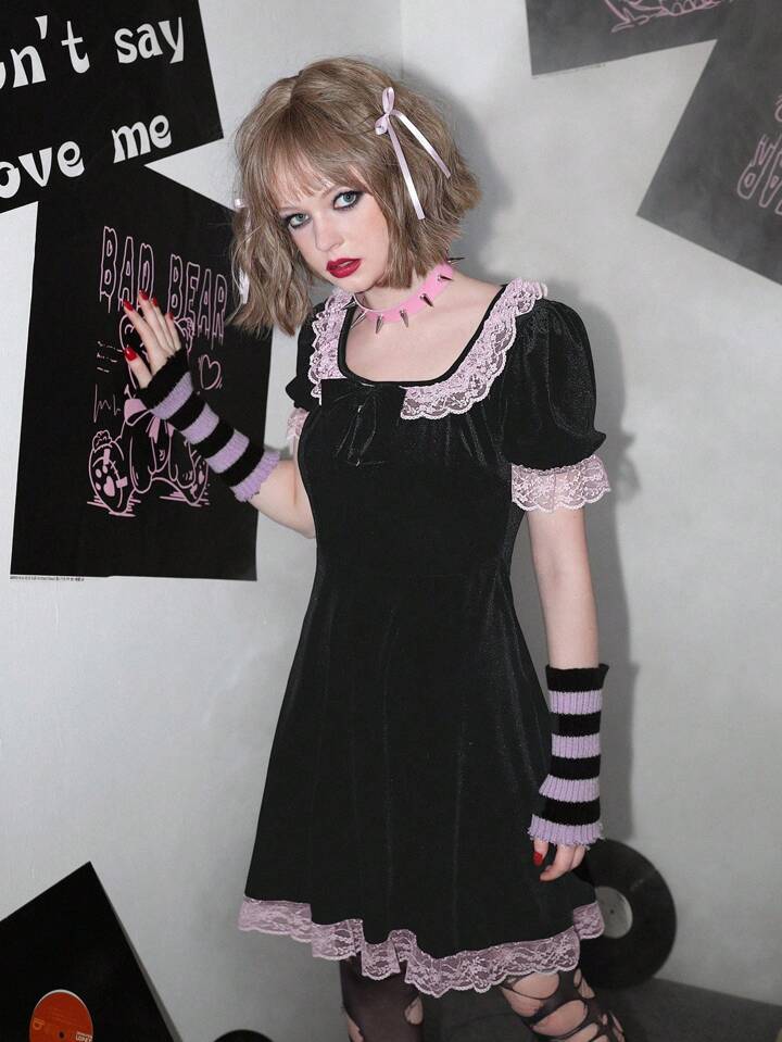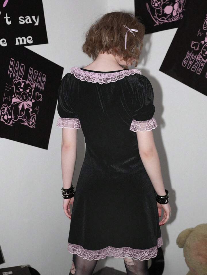 Contrast Lace Puff Sleeve Velvet Dress