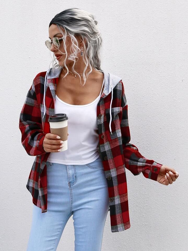 Contrast Panel Plaid Drawstring Hooded Coat