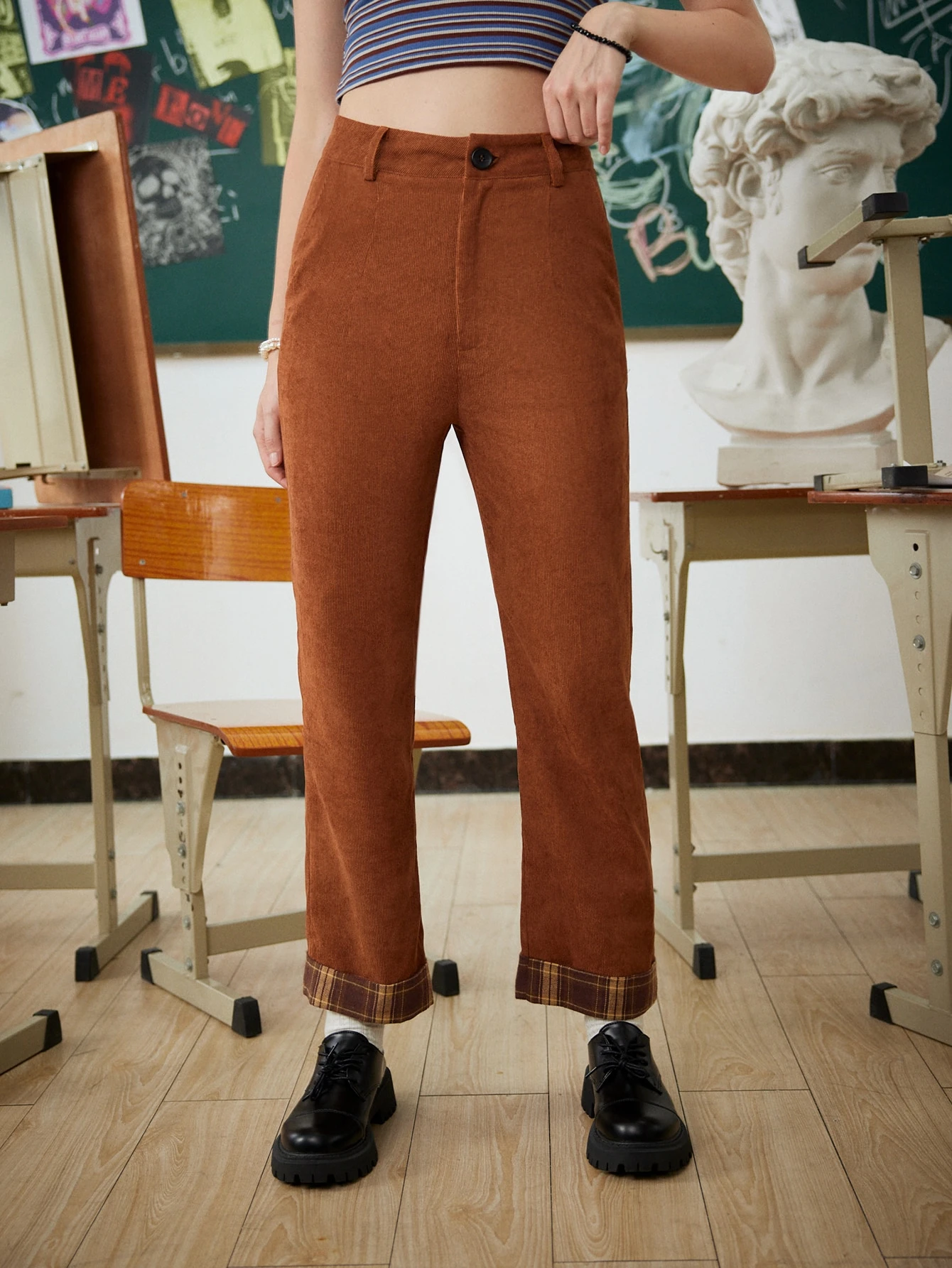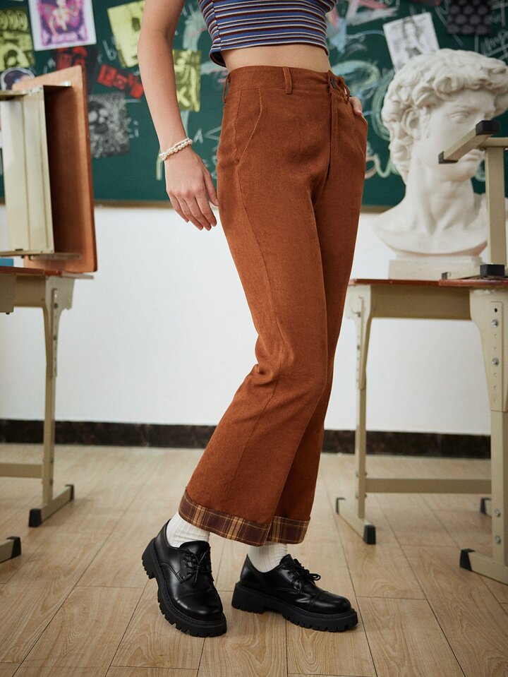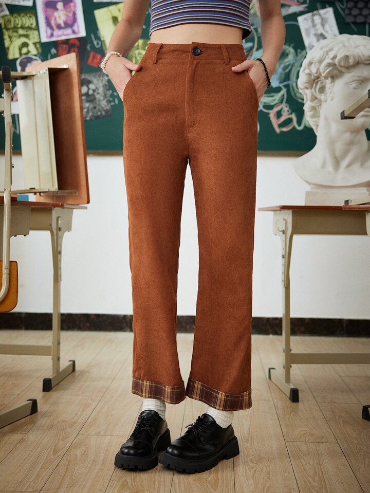 Contrast Plaid Corduroy Pants