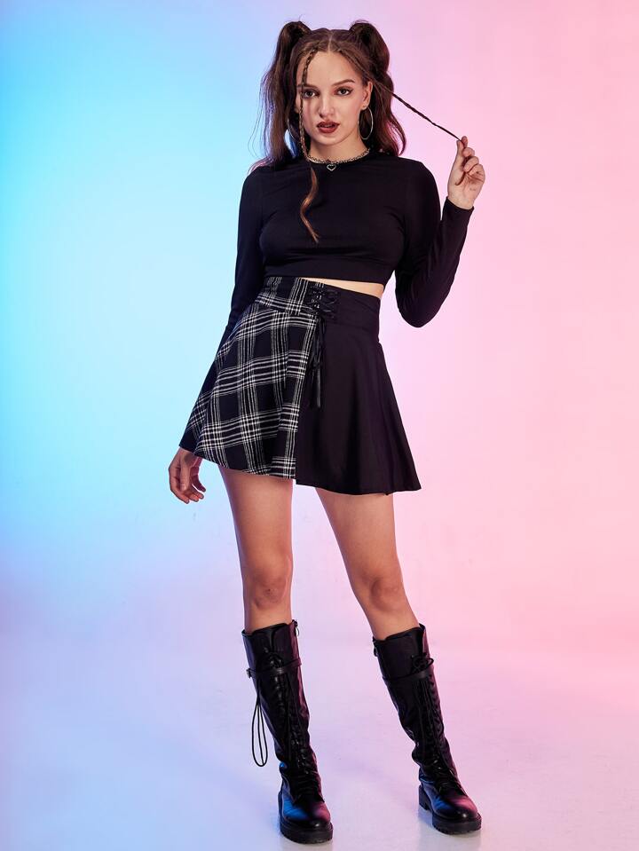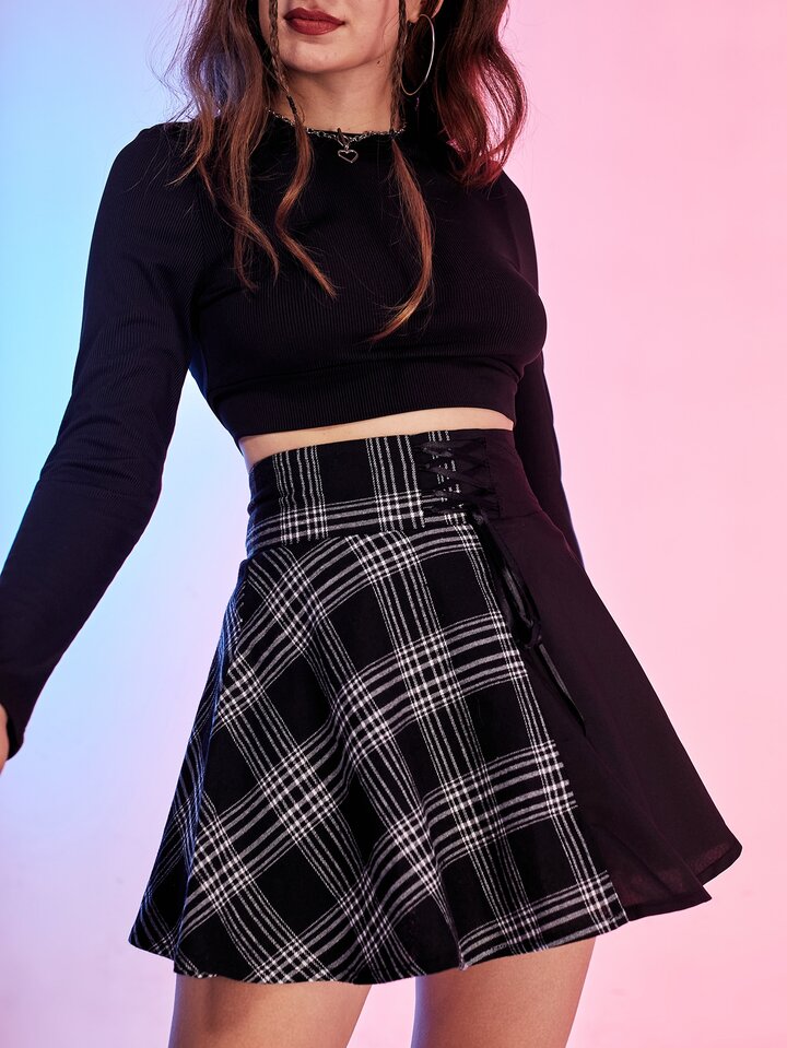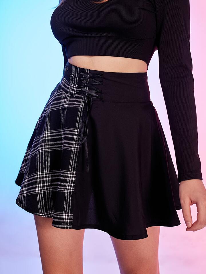 Contrast Plaid Criss Cross Lace Up Skirt