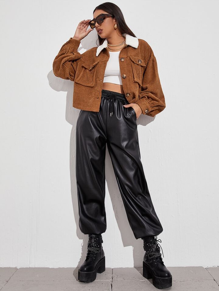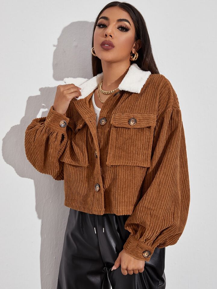 Contrast Shearling Collar Button Front Flap Pocket Cord Jacket