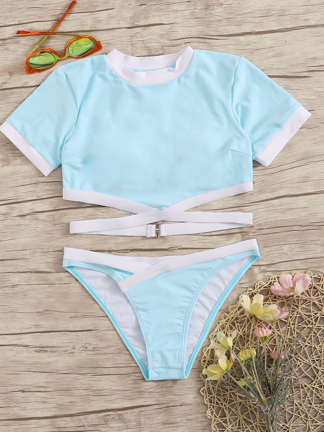 Contrast Trim Short Sleeve Two Piece Swimwear