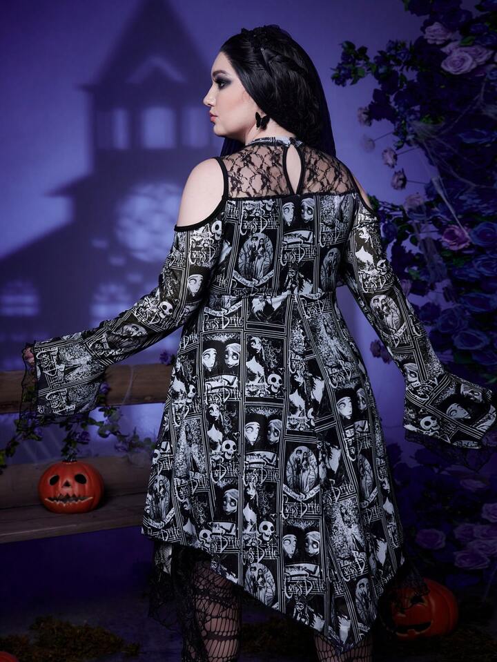 Corpse Bride | ROMWE Plus Halloween Print Cold Shoulder Flounce Sleeve Hanky Hem Dress