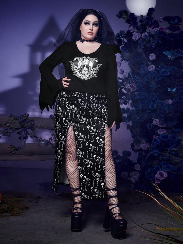Corpse Bride | ROMWE Plus Skeleton Print Split Thigh Skirt