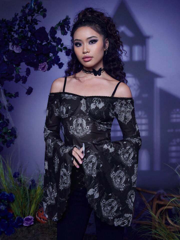Corpse Bride | ROMWE Skull Print Cold Shoulder Mesh Top