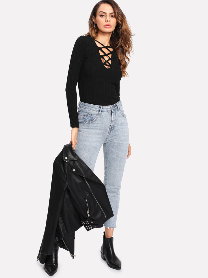 Crisscross Plunge Rib Knit T-shirt