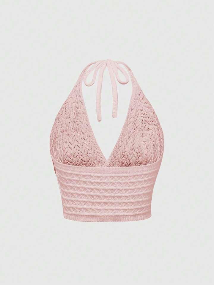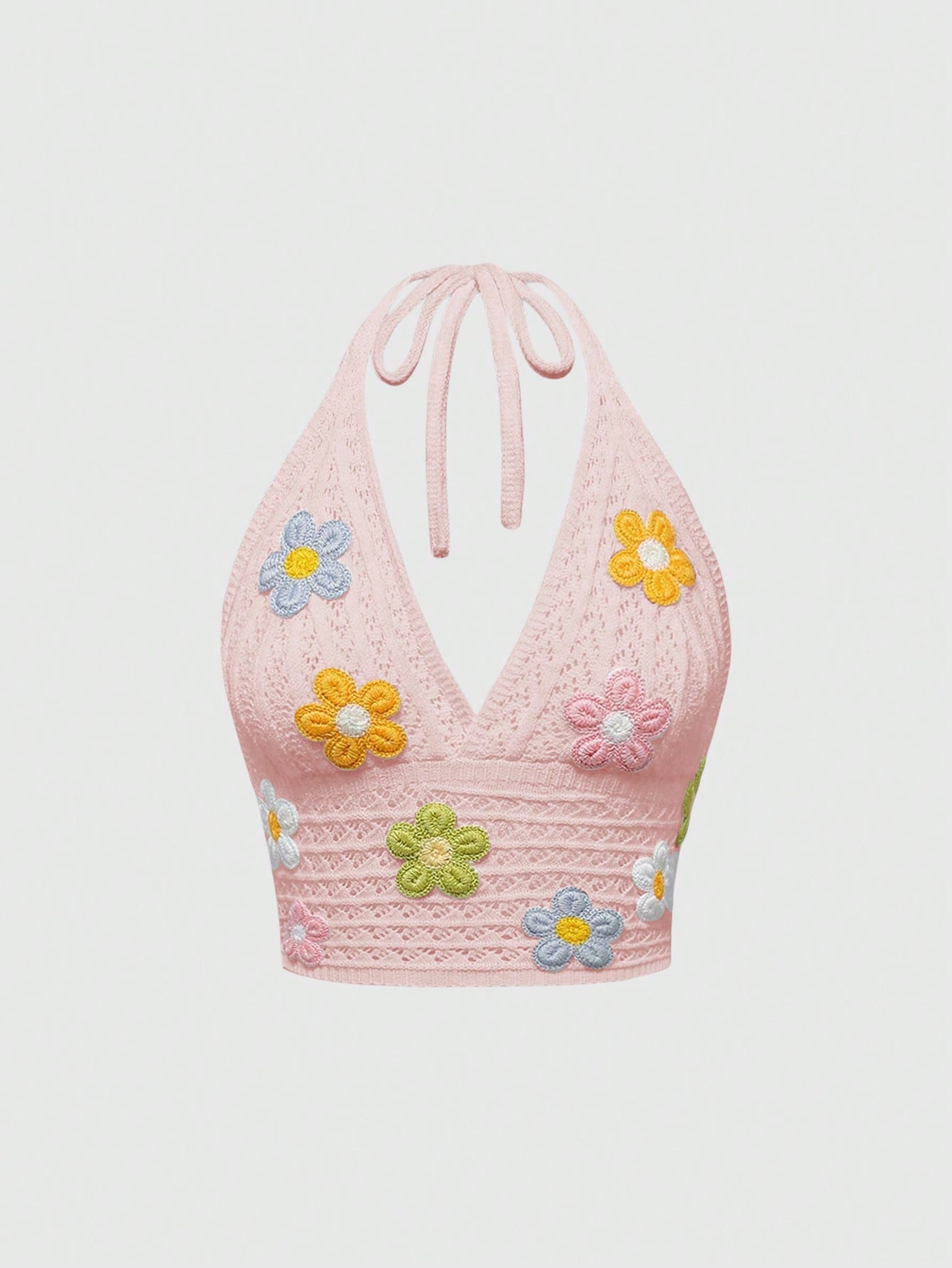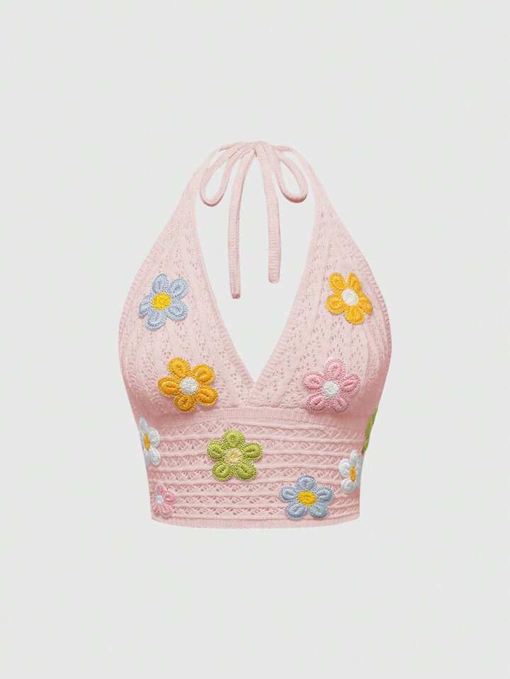 Crochet Floral Halter Neck Casual Top, Vacation Style