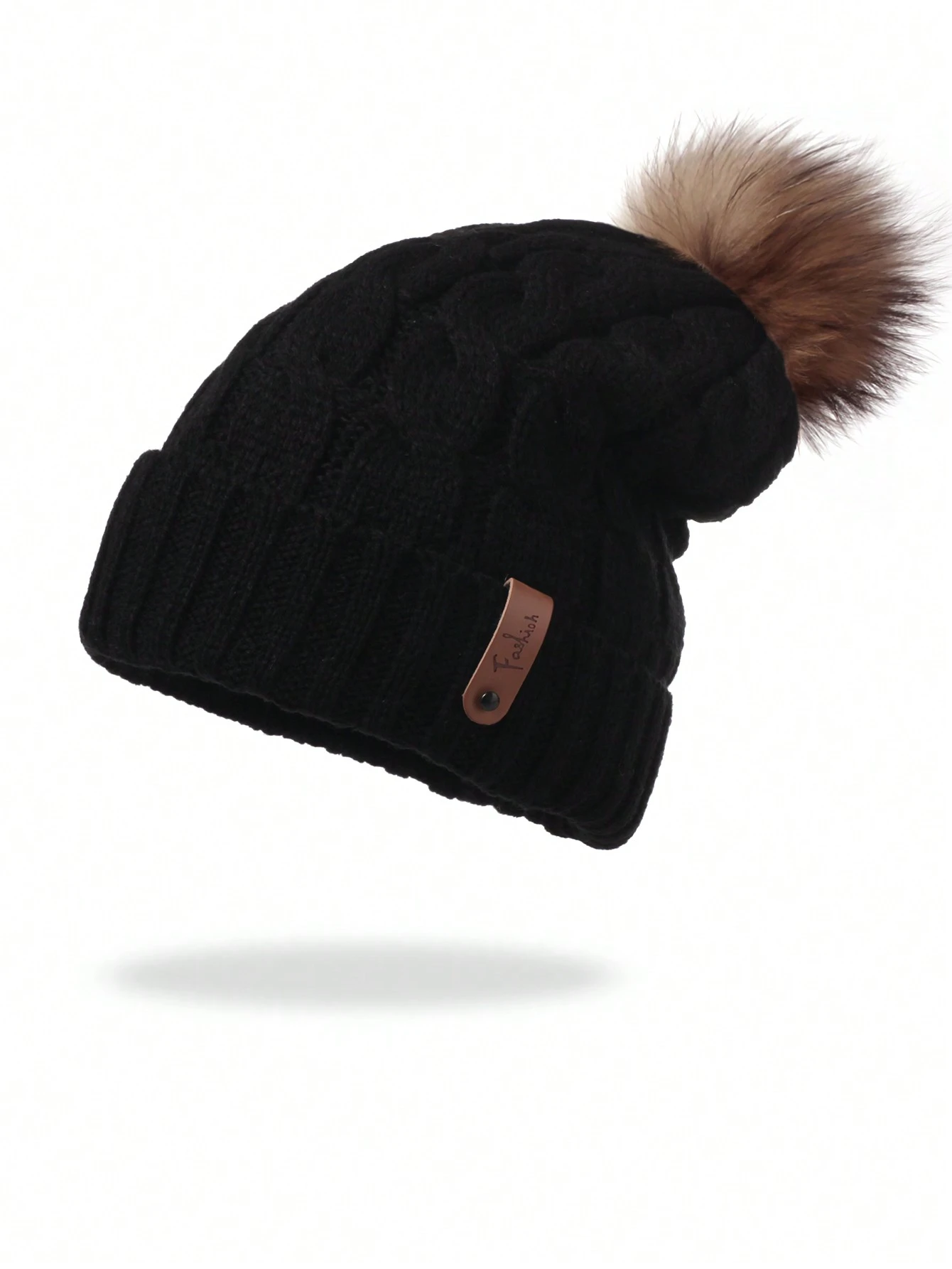 Cute 1pc Women's Winter Knitted Hat With Leather Label Thick Warm Cold-Proof Beanie Cap For Outdoor Activities