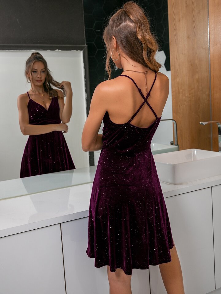D&M Ruched Crisscross Rhinestone Detail Velvet Cami Dress Night Out Party Dresses