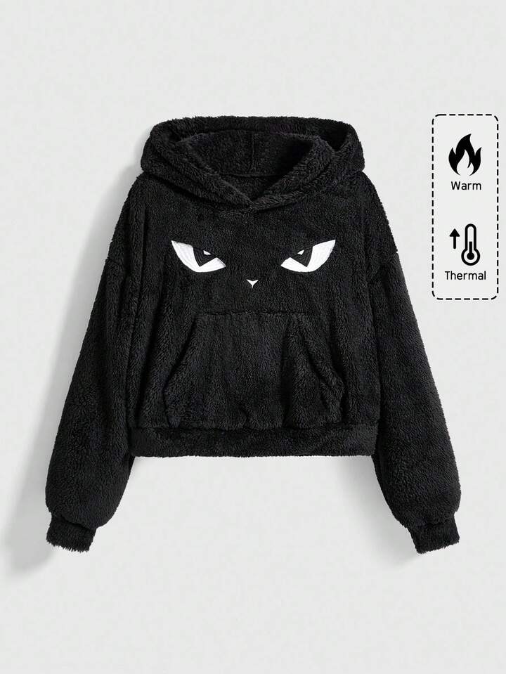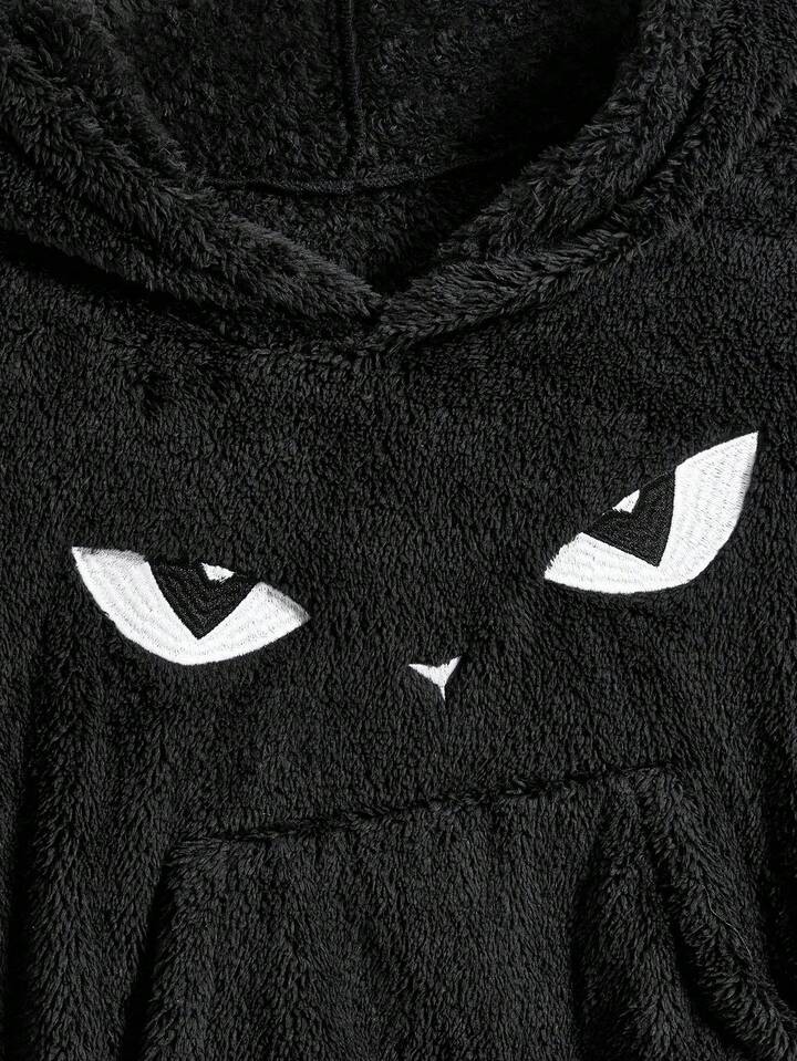 Dark Gothic Black Cat Embroidery Thermal Lined Casual Hooded Long Sleeve Sweatshirt For Women, Autumn/Winter