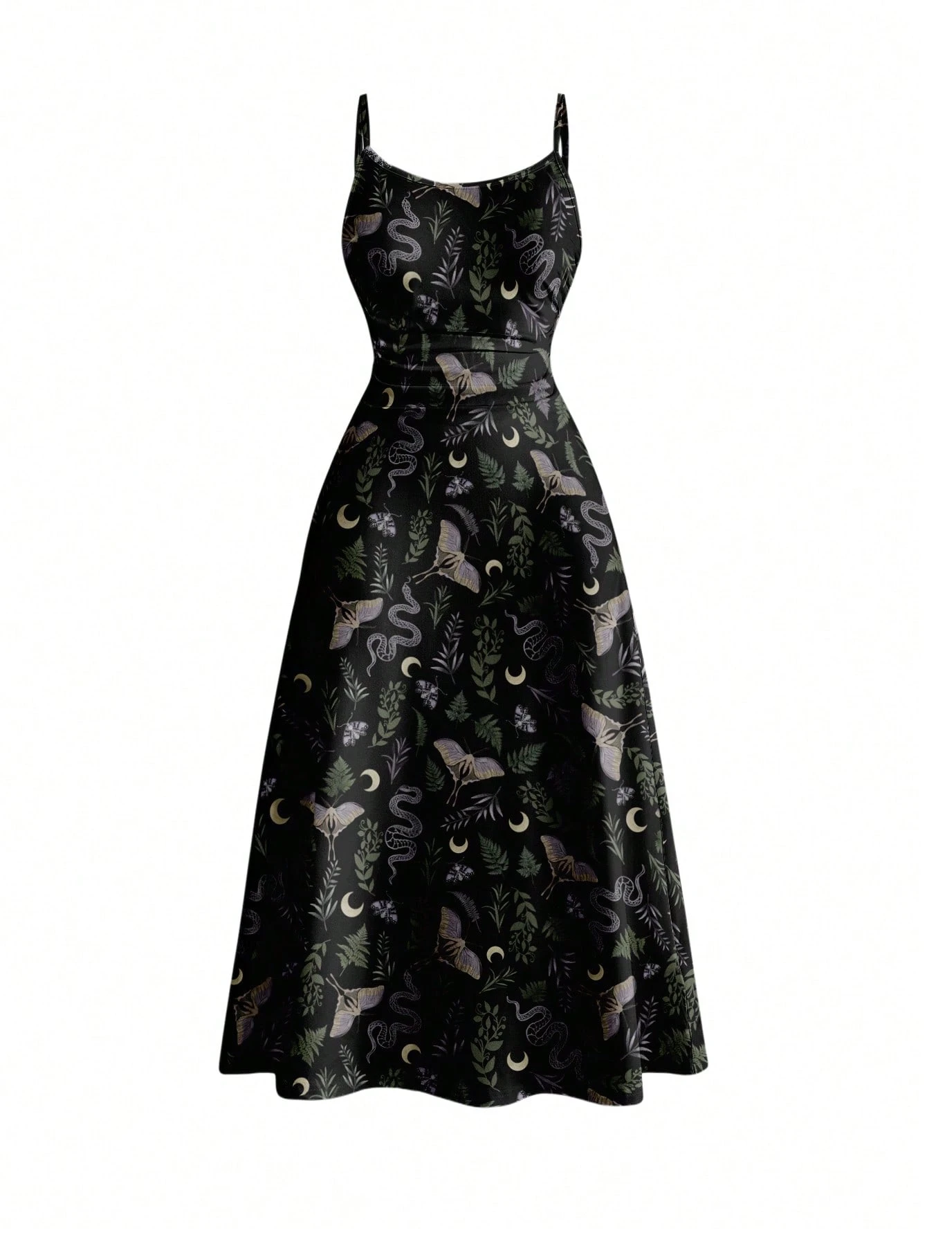 Dark Gothic Mysterious Butterfly, Snake, Moth, Leaf Print Sexy Backless Bodycon Dress For Beach Vacation