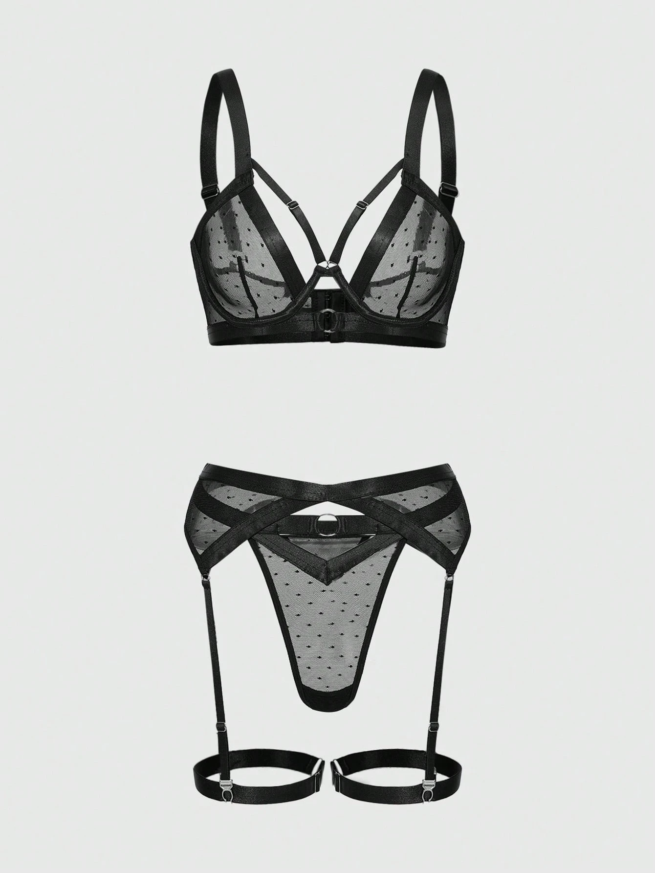 Dark Gothic Polka Dot Jacquard Fabric Triangle Cup Thong Garter Sexy Lingerie Set 3 Pieces
