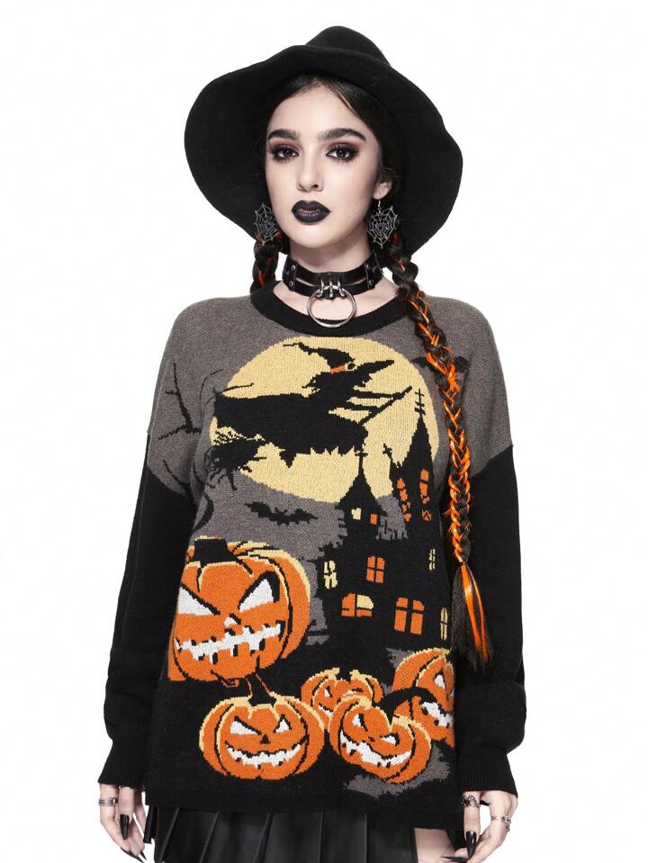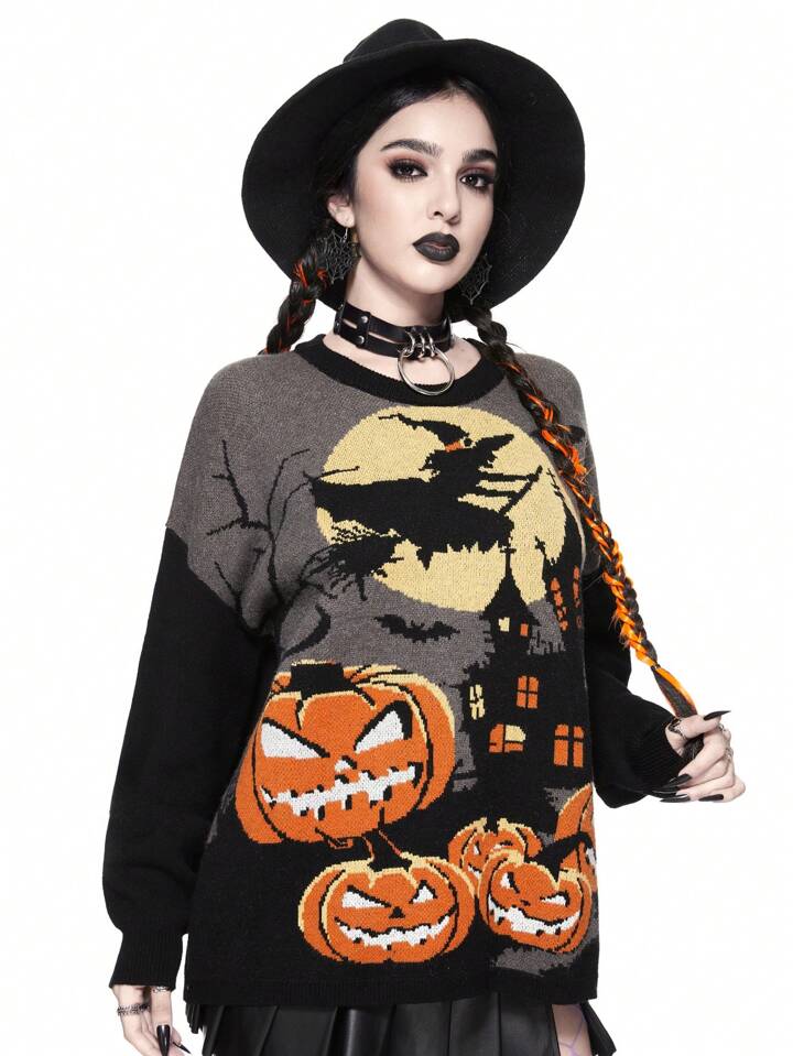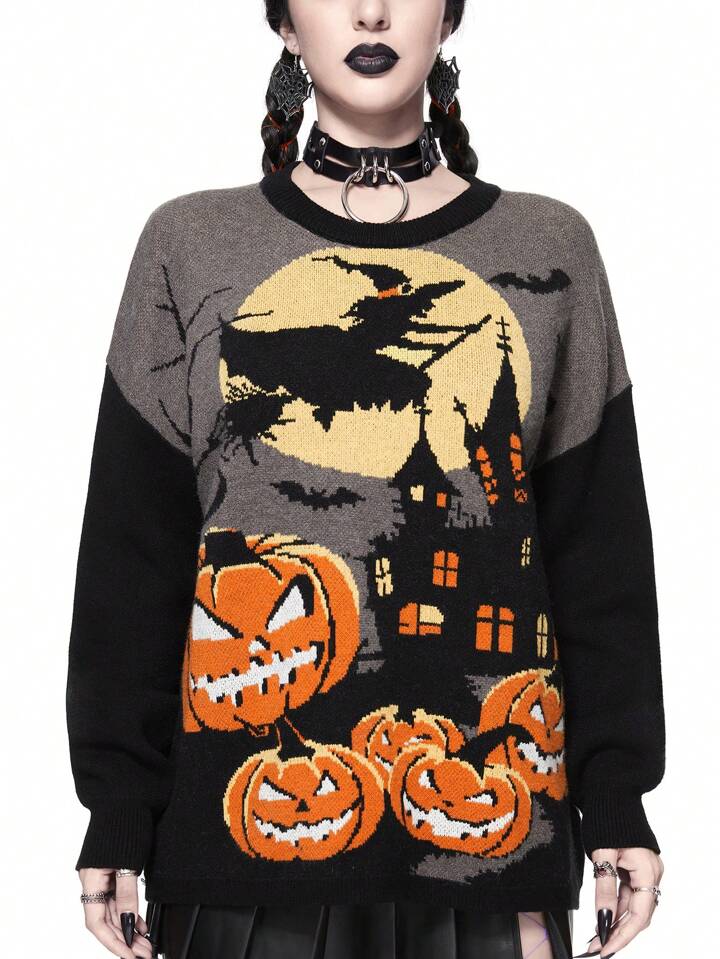 Dark Gothic Pumpkin Witch Bat Pattern Loose Pullover Sweater