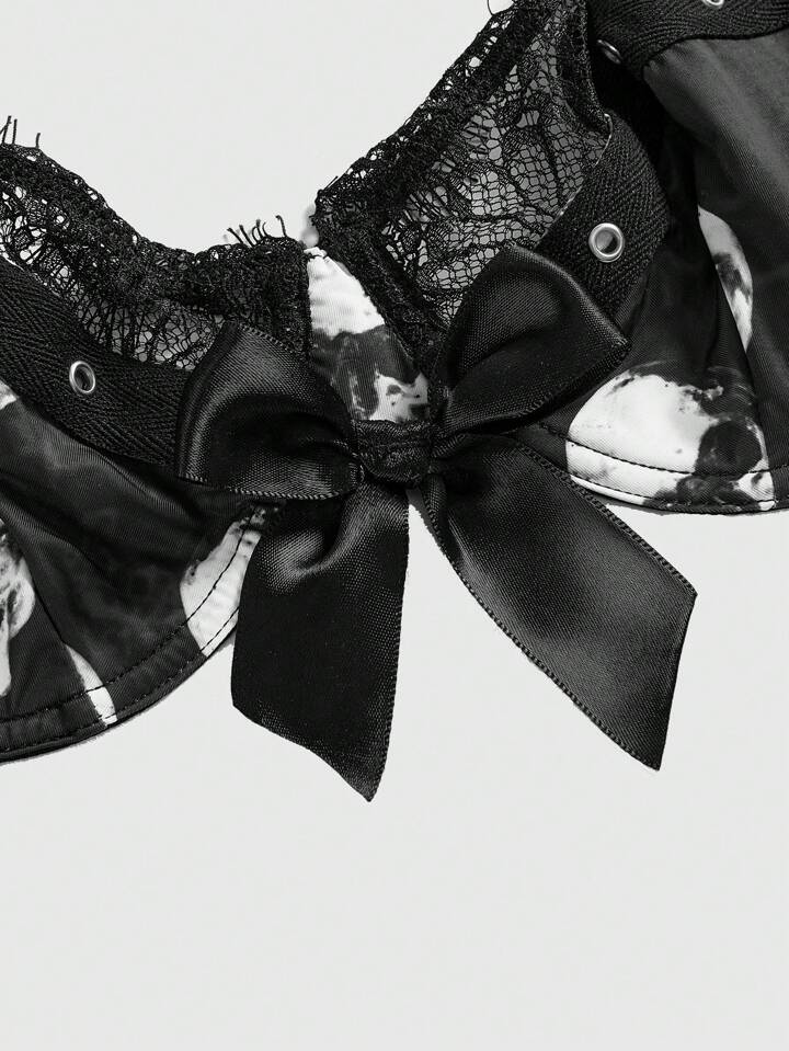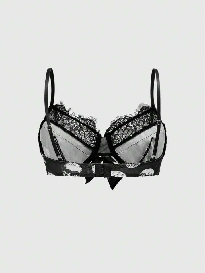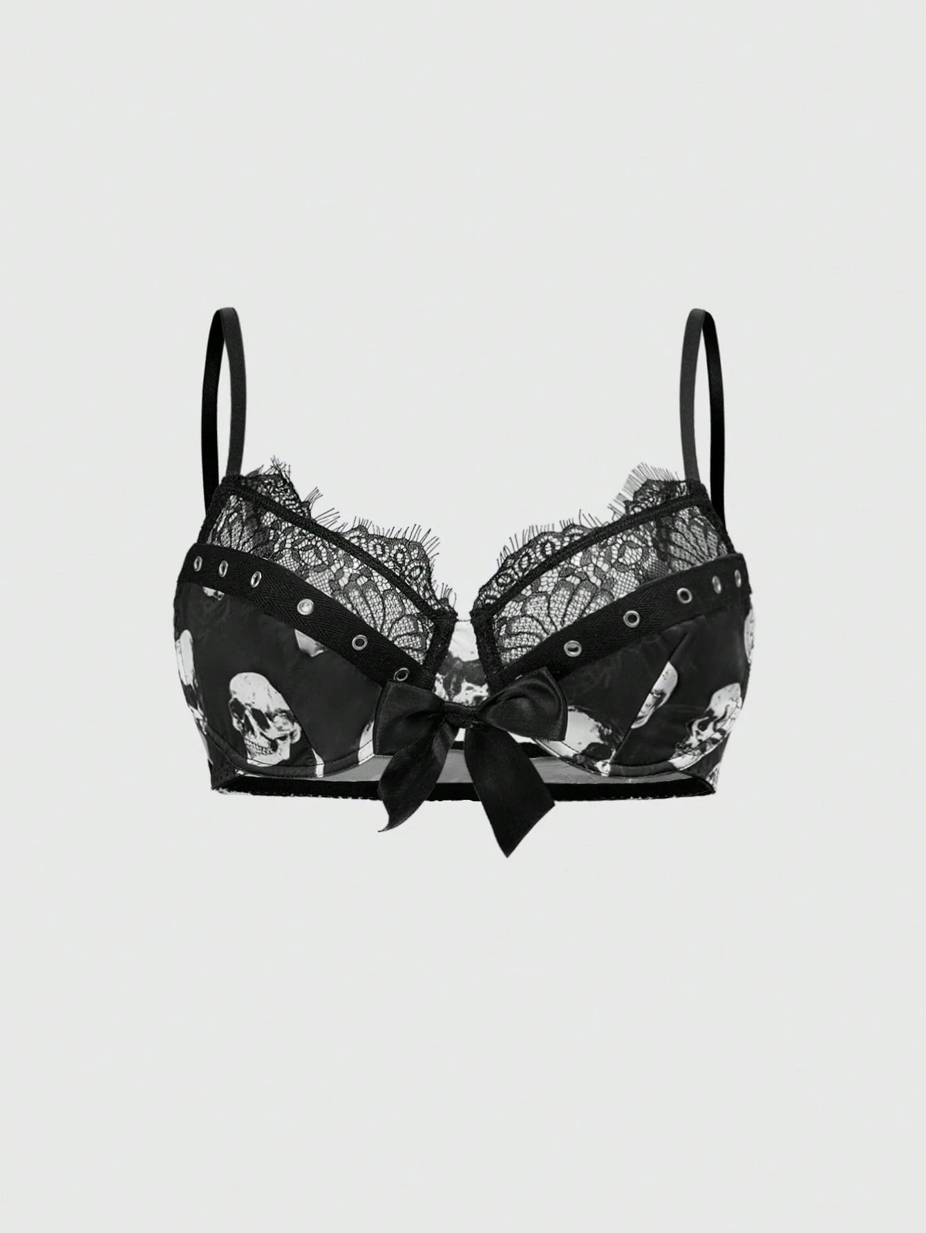 Dark Gothic Skull Print Underwire Cup Splice Lace Grommet Jacquard Lingerie Bra