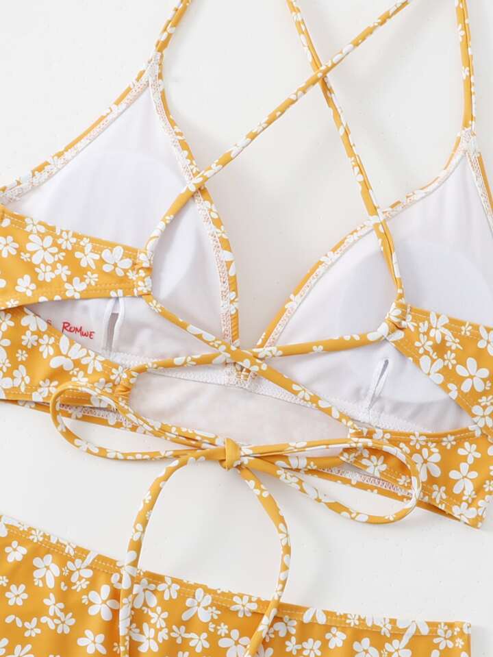 Ditsy Floral Criss Cross Lace Up Bikini, For Summer Beach Vacation