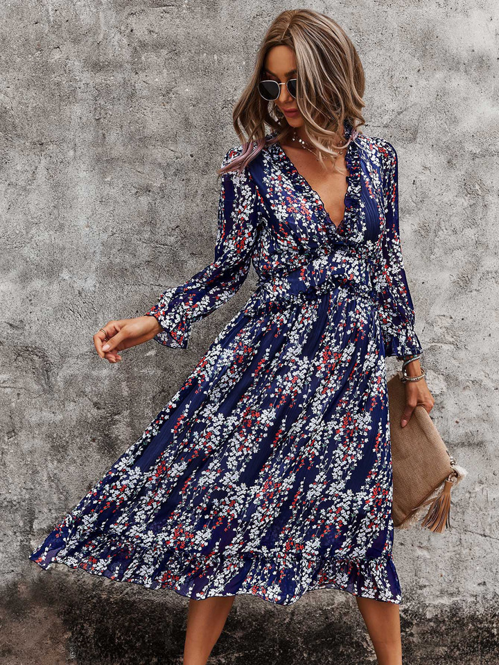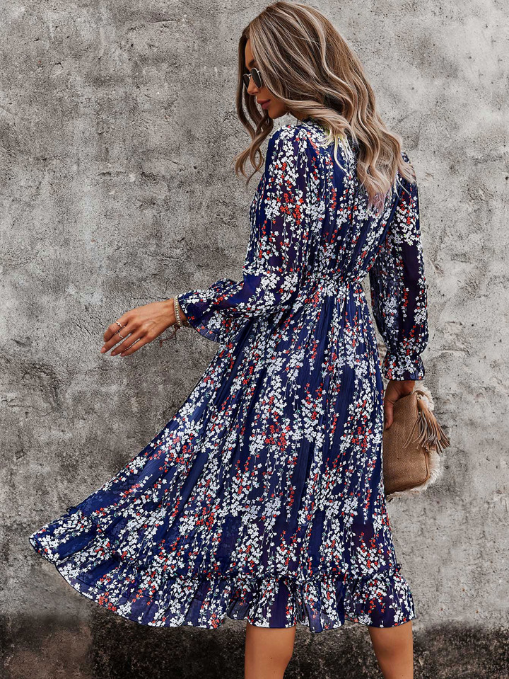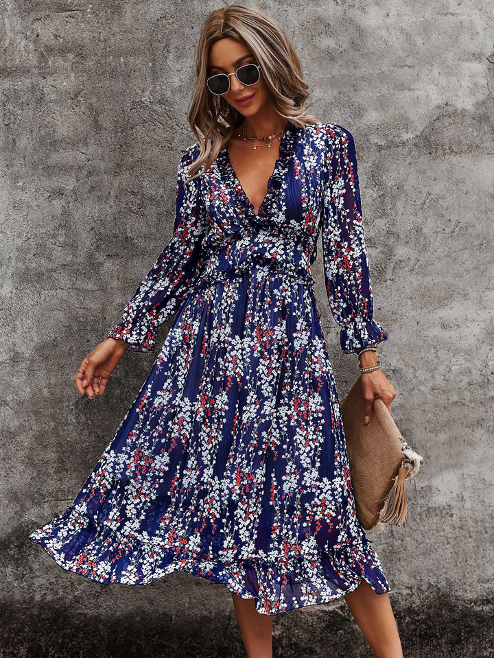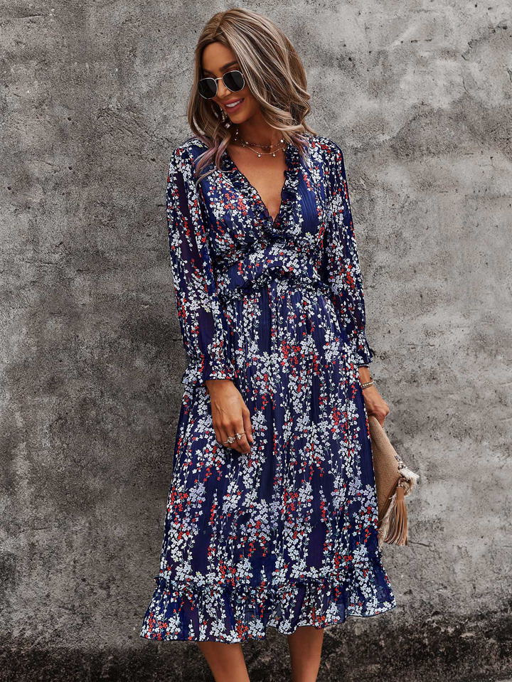 Ditsy Floral Deep V-neck Ruffle Hem Dress