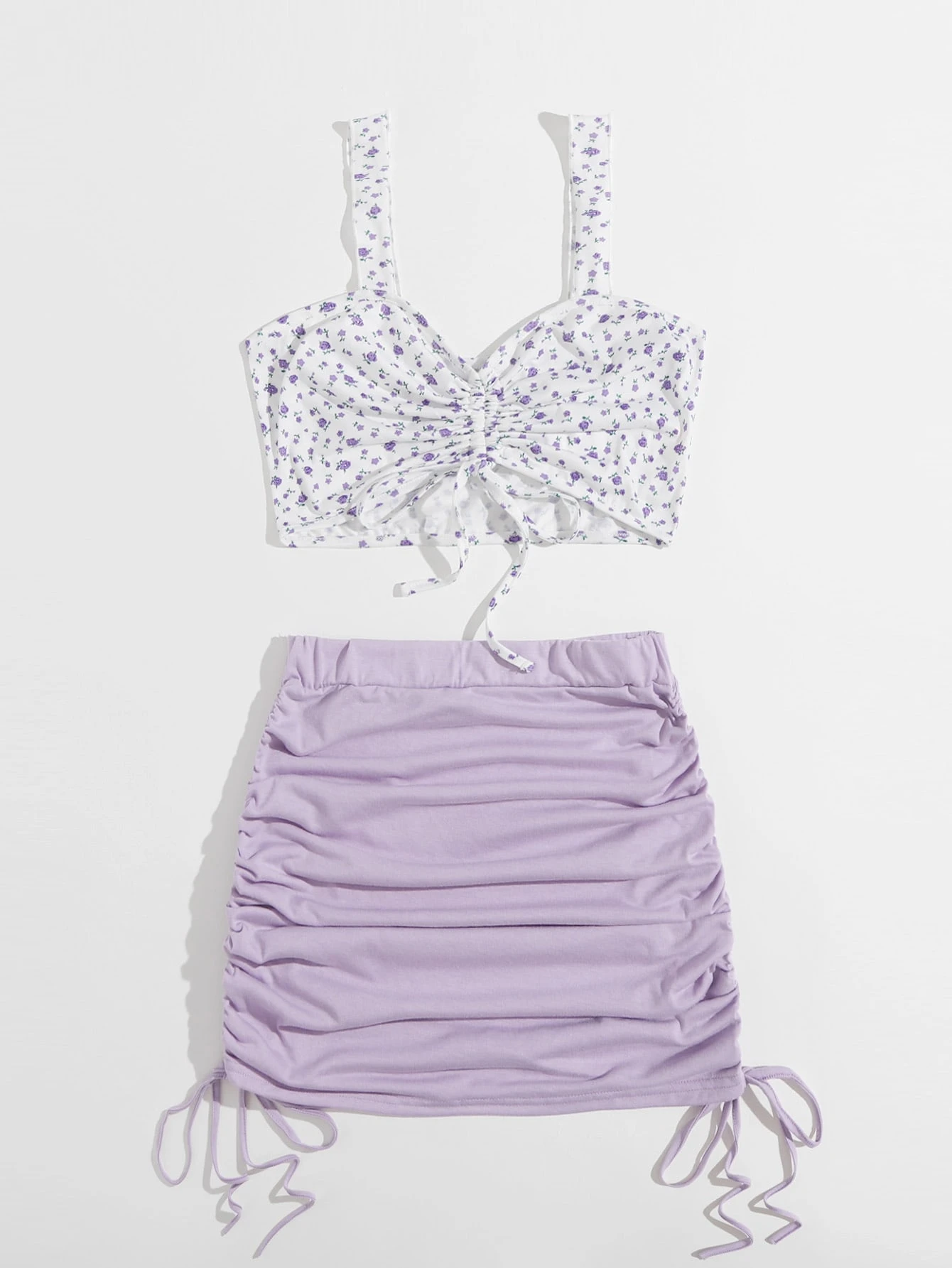 Ditsy Floral Drawstring Crop Cami & Solid Drawstring Dress