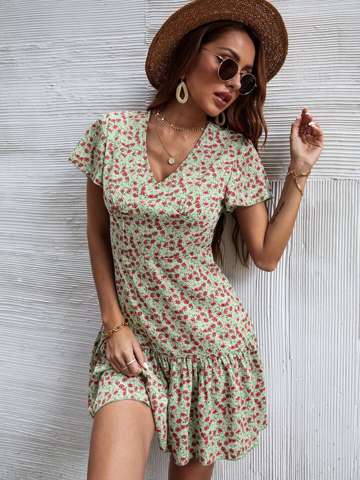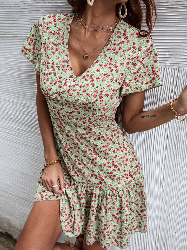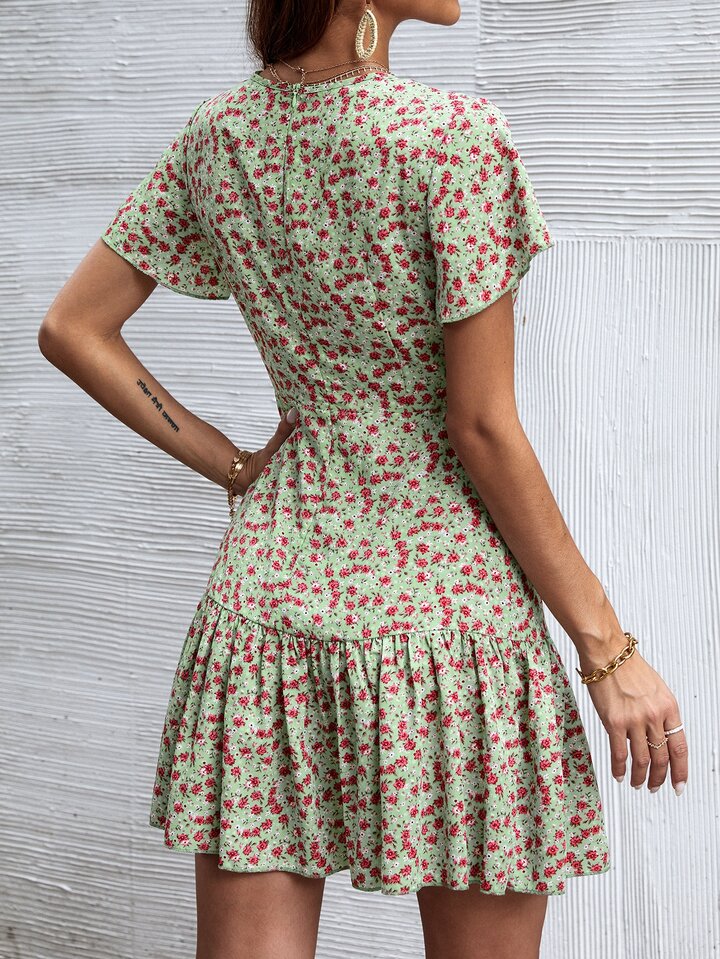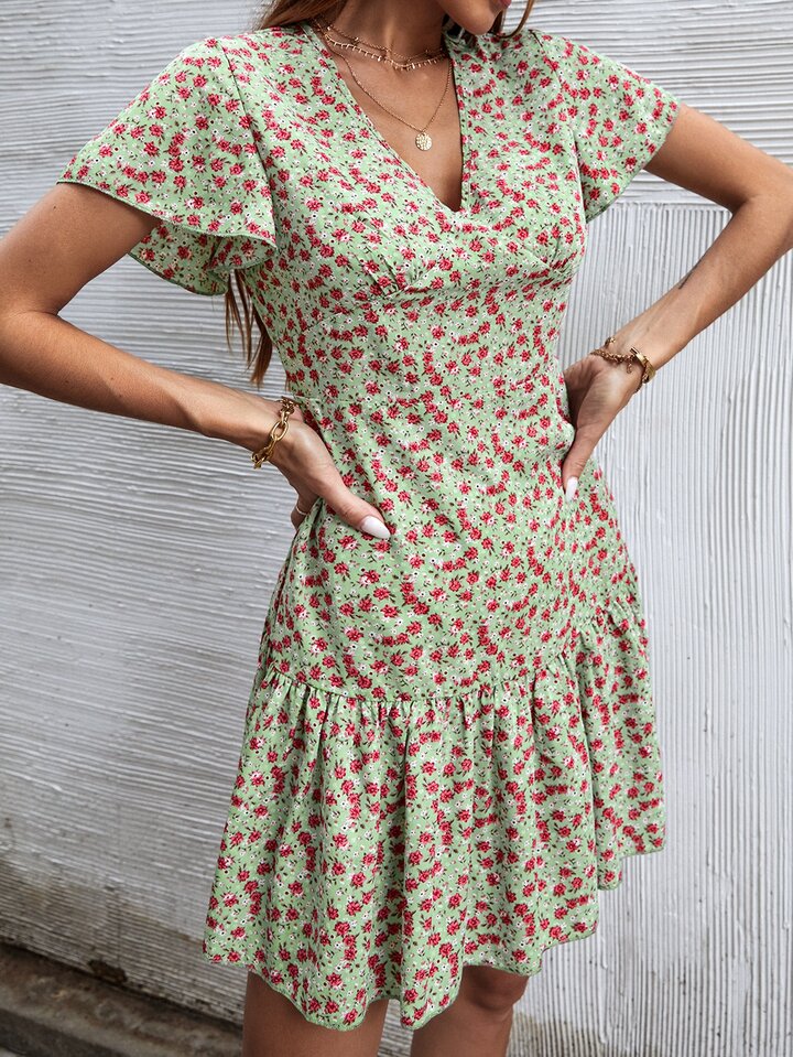 Ditsy Floral Print Butterfly Sleeve Ruffle Hem Dress