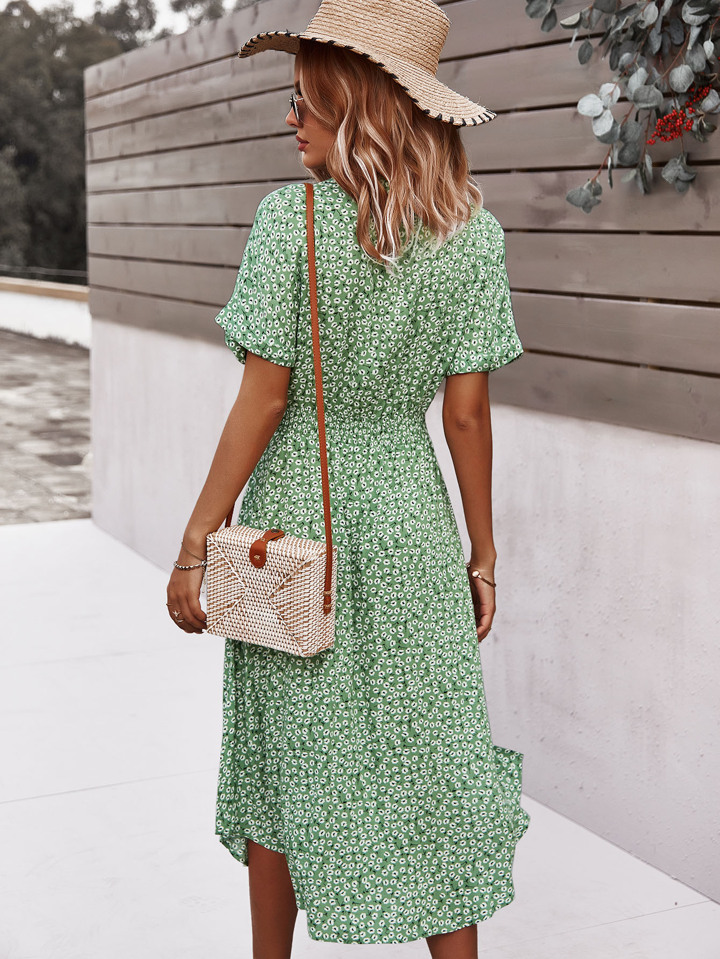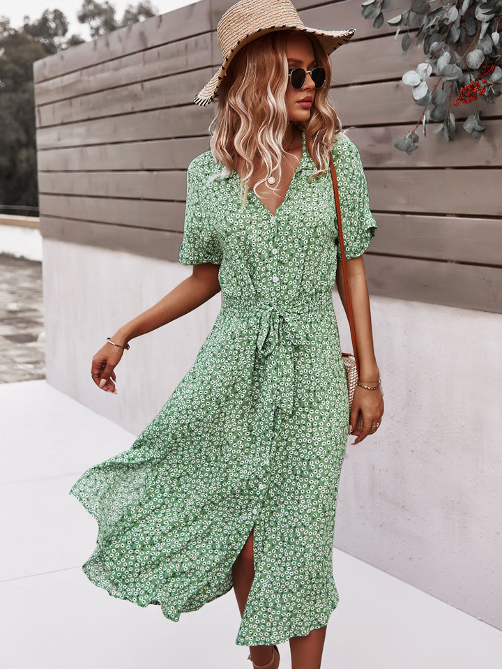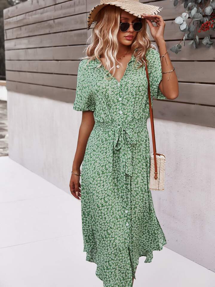 Ditsy Floral Tie Front Button Through Dress Maxi Women Outfit