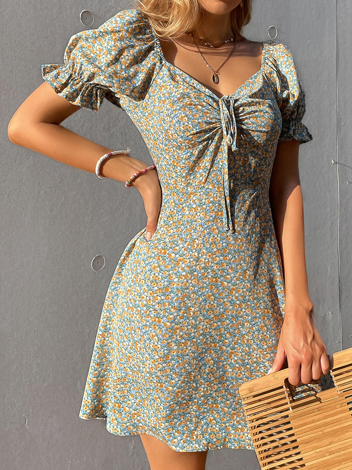 Ditsy Floral Tie Front Puff Sleeve Dress
