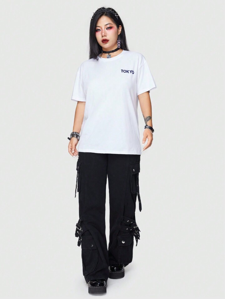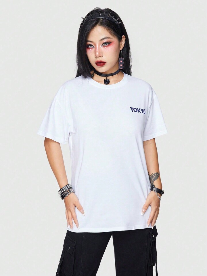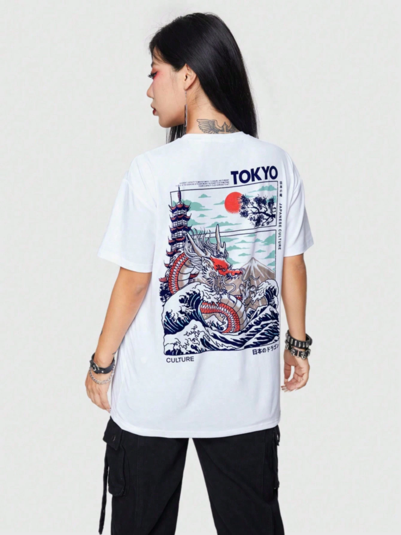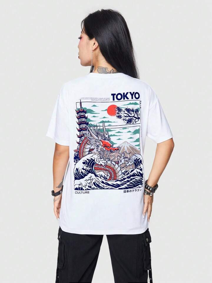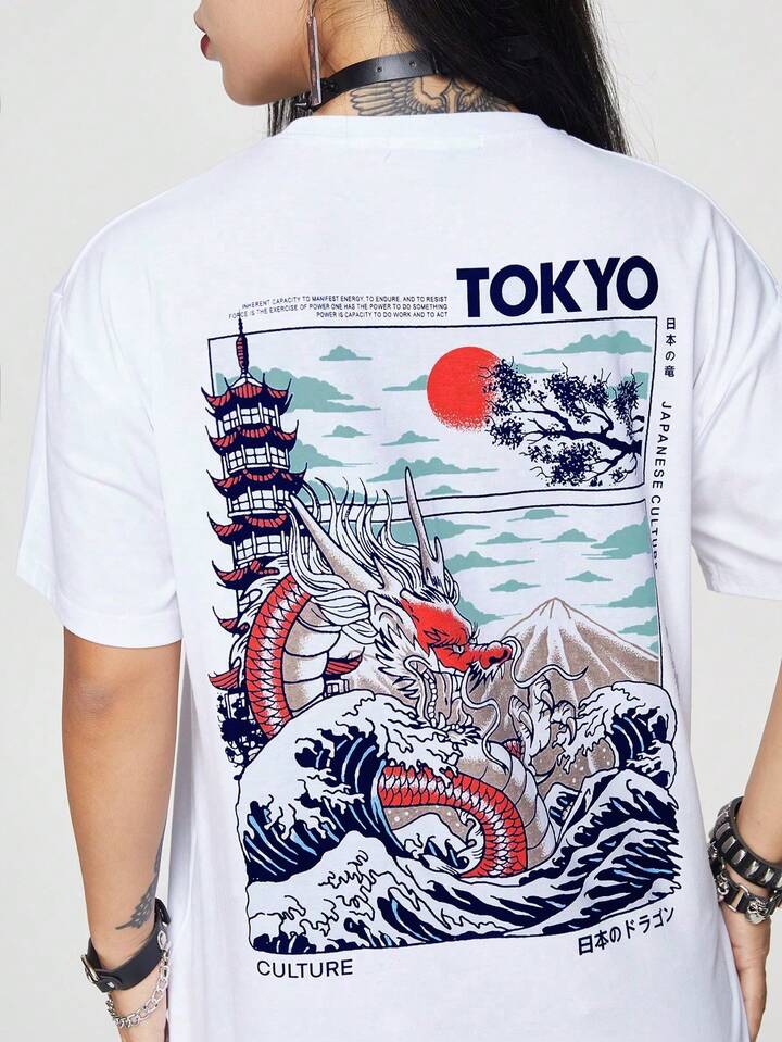 Dragon & Slogan Print Batwing Sleeve T-shirt