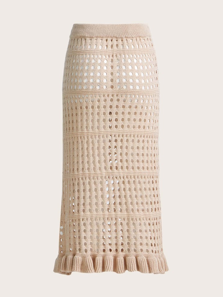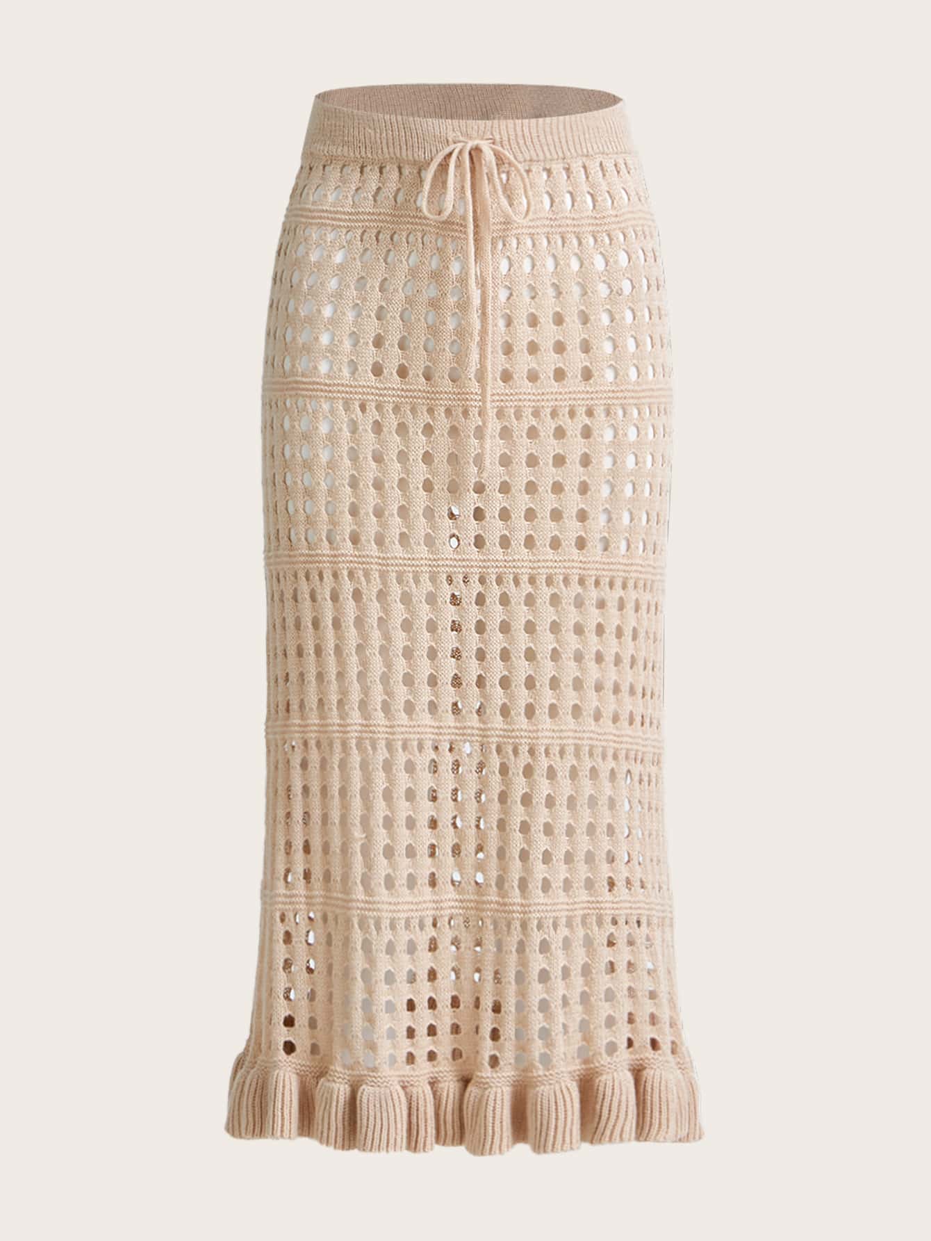 Drawstring Waist Ruffle Hem Pointelle Knit Skirt
