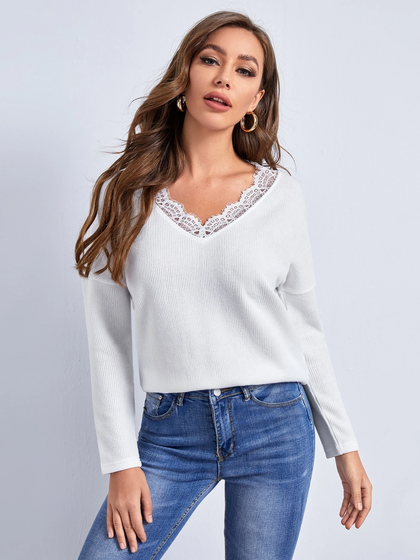 Drop Shoulder Lace Trim Sweater