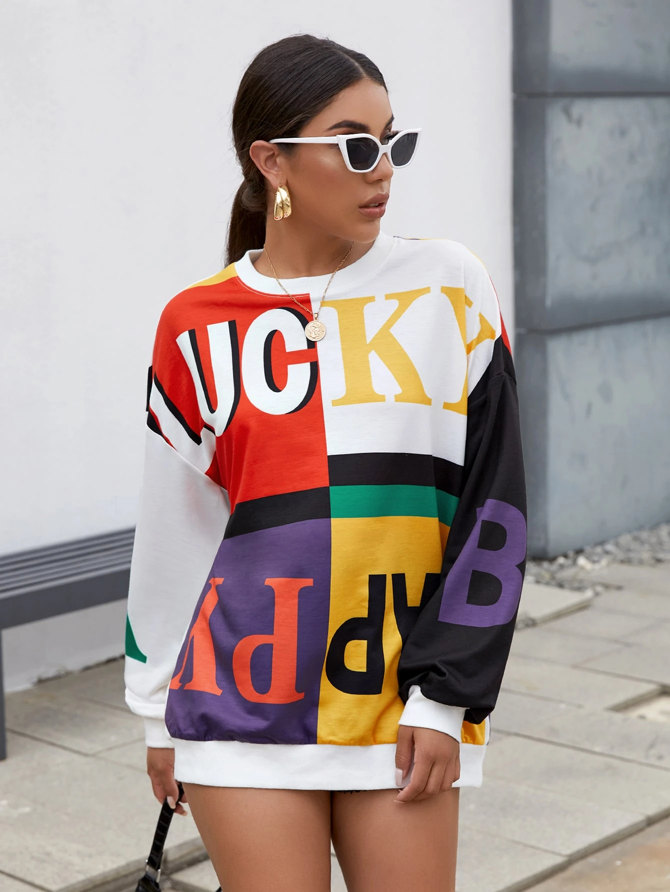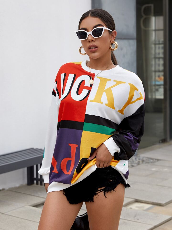Drop Shoulder Letter Graphic Colorblock Pullover