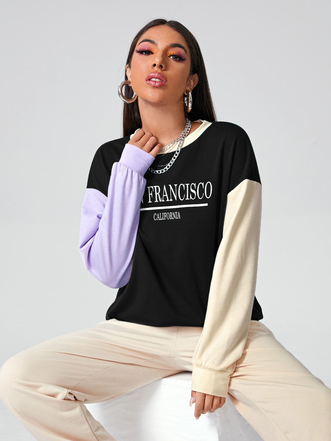 Drop Shoulder Letter Graphic Colorblock Pullover