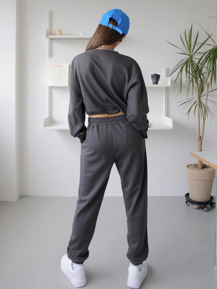 Drop Shoulder Patched Drawstring Sweatshirt & Sweatpants