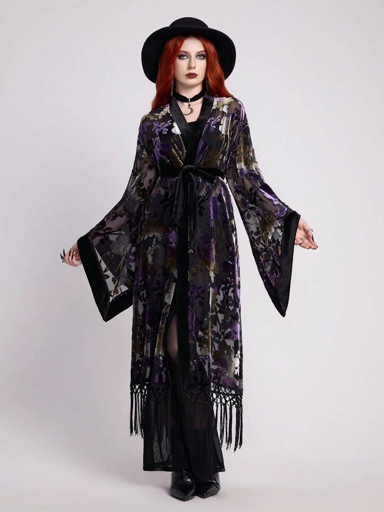 EDITION Bohemian Goth Style Floral Burnout Velvet Texture Beach Flare Sleeve Cardigan