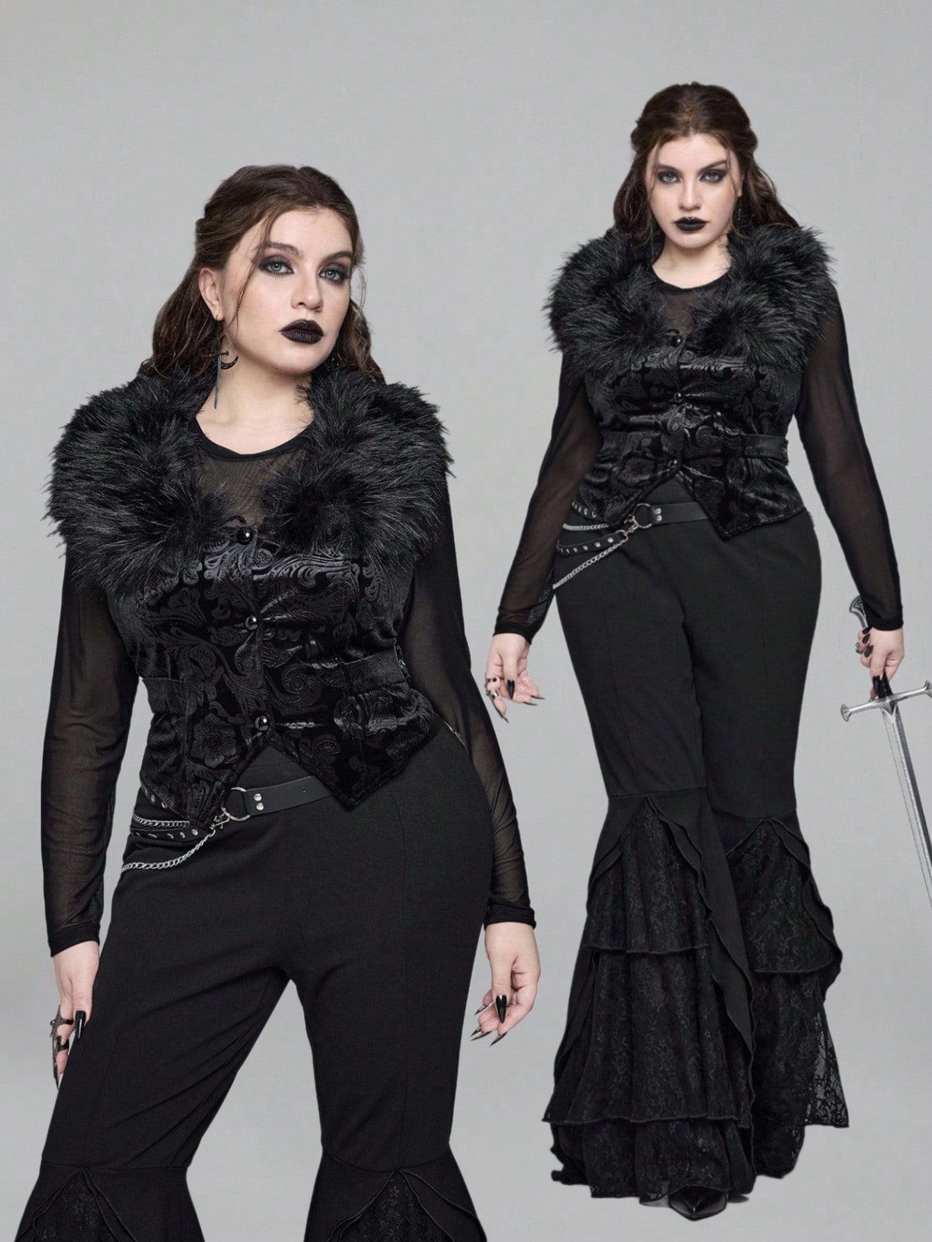 EDITION Plus Size Goth Mysterious Velvet Print Detachable Faux Fur Collar Vest