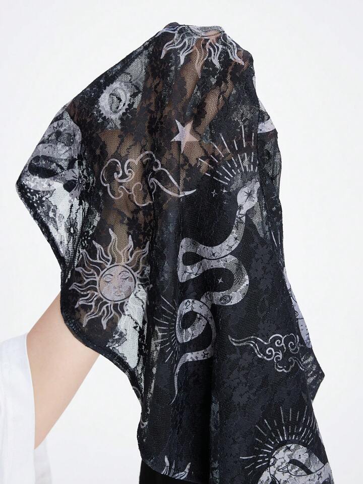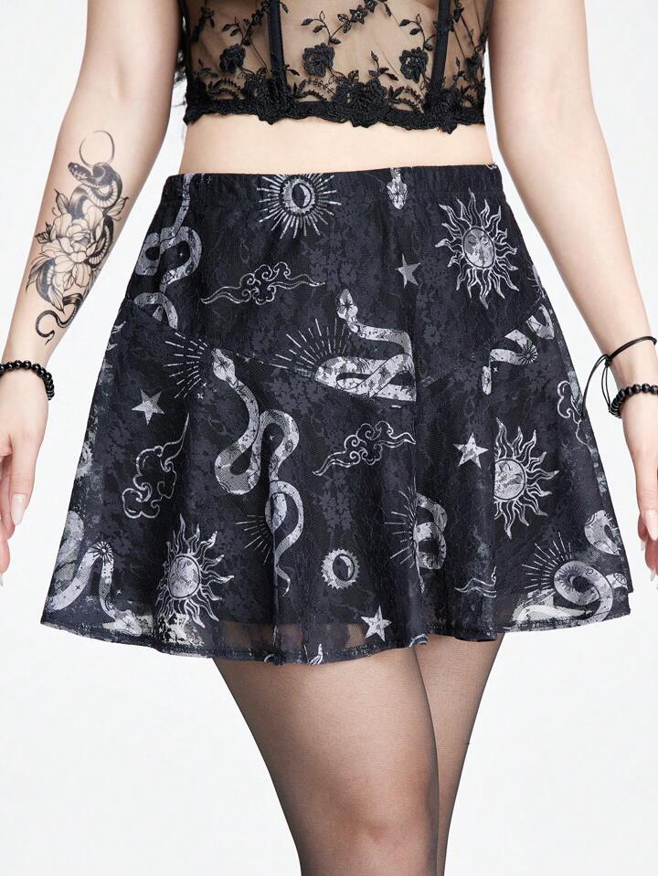 Elegant And Mature Gothic Hippie Style Skirt With Elastic Waist, Pleating, A-Line, Sun, Moon, Stars And Snake Allover Print Patterns, For Women