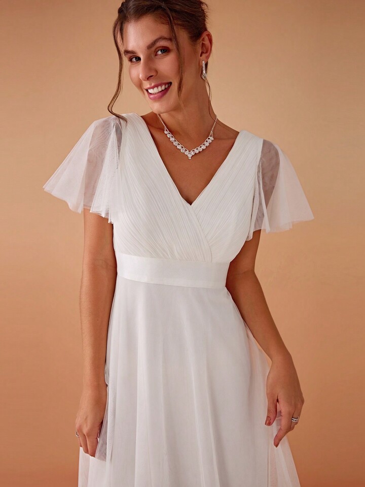 Elegant V Back Surplice Neck Ruched Mesh Prom Bachelorette Party Dresses Bridal Shower Dress For Bride Wedding Dress White Dress Engagement Dresses