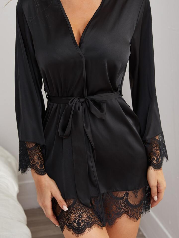 Eyelash Lace Trim Self Belted Satin Belted Night Robe Luxeloungewear, Fall & Winter Cozy And Elegant