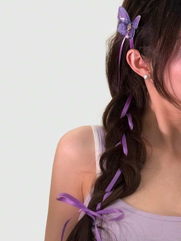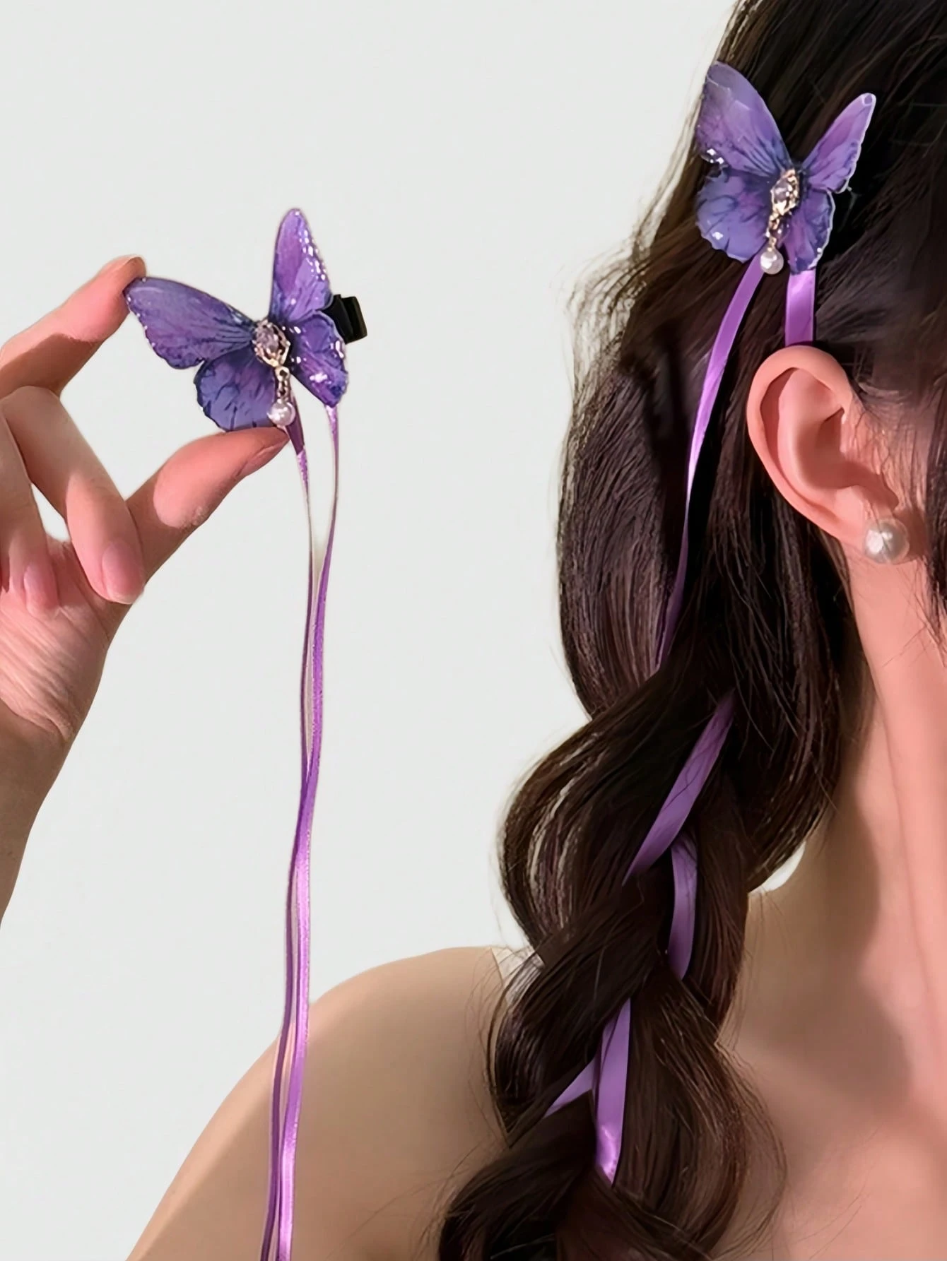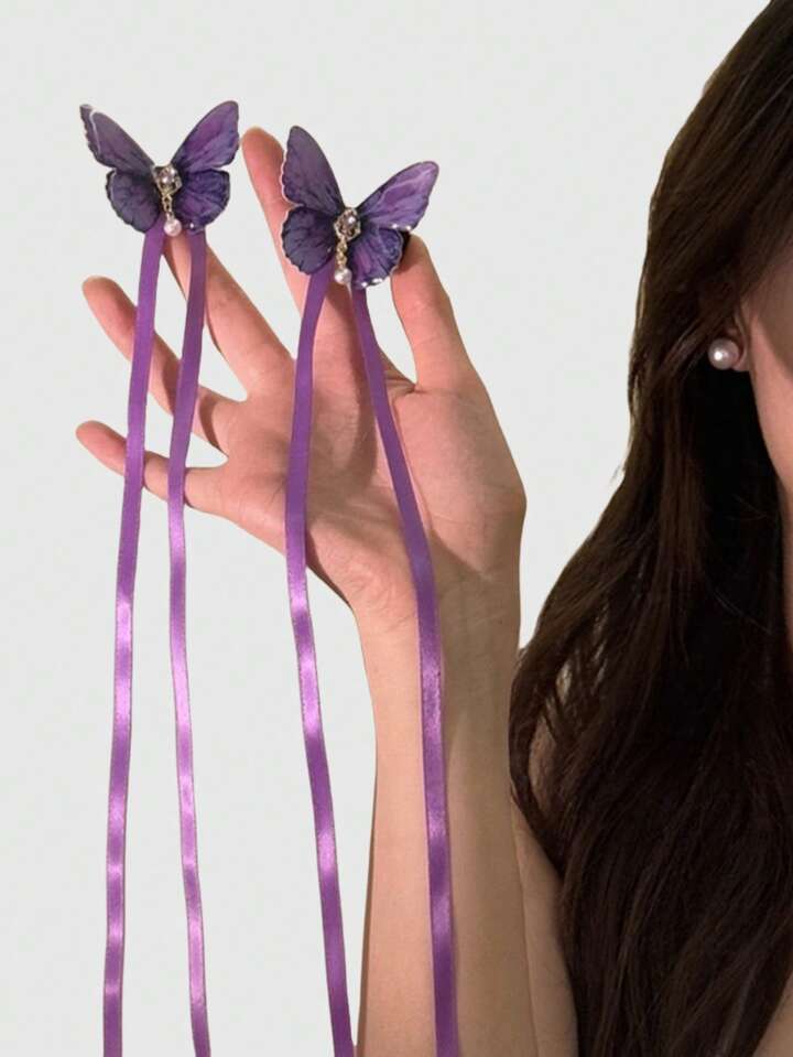 Fairycore 1 Pair Purple Ribbon Bow Butterfly Decorative Hair Clips, Sweet Fairy Style, For Women, All Season