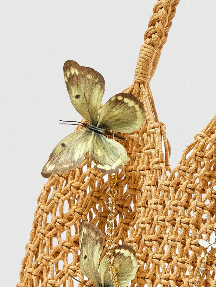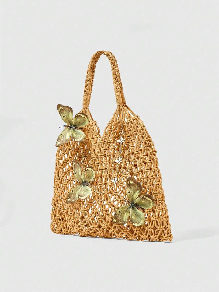 Fairycore 1 Set Khaki 3pcs Crochet Butterfly Beach Tote Bag & Accessories, Personalized Fashion Beach Resort Style Women Tote Bag (Includes 1 Bag And 1 Set Of Accessories)