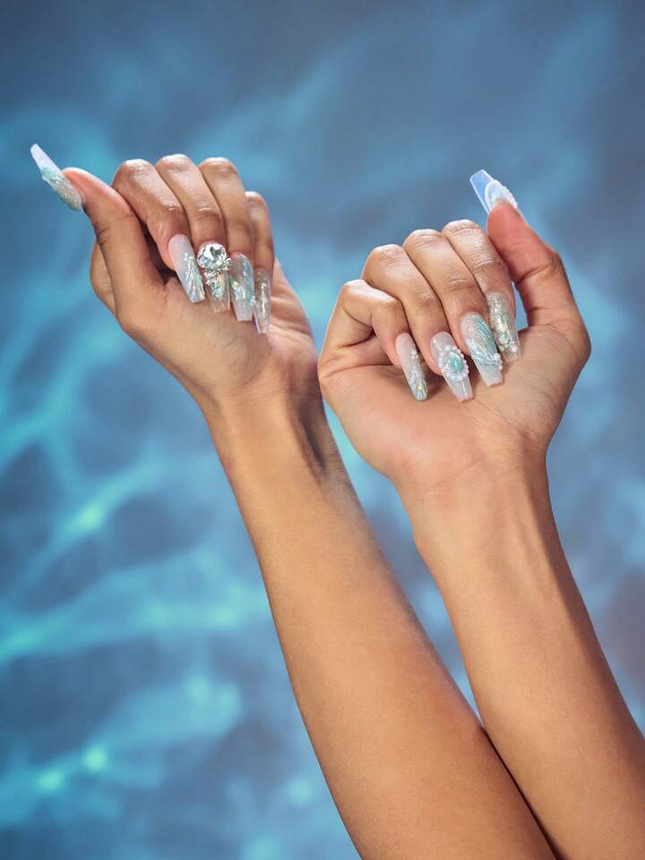 Fairycore 10pcs Cute Bowknot Pearls Stars Mermaid Style Press-On Nails + 3pcs Double-Sided Adhesive Sticker, Removable Green Holographic Cat Eye Nail Art Sticker For Holiday Party, Dance And Daily Wear, High Quality