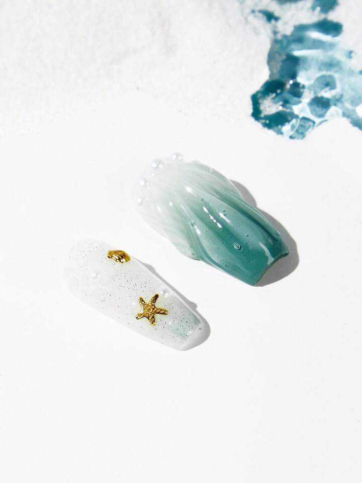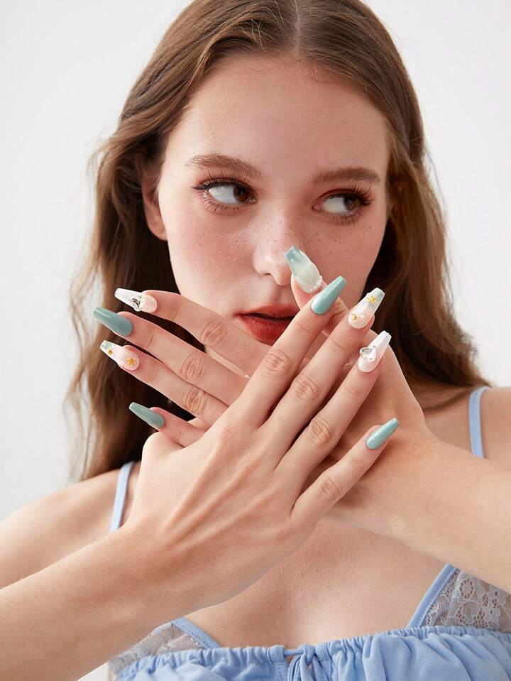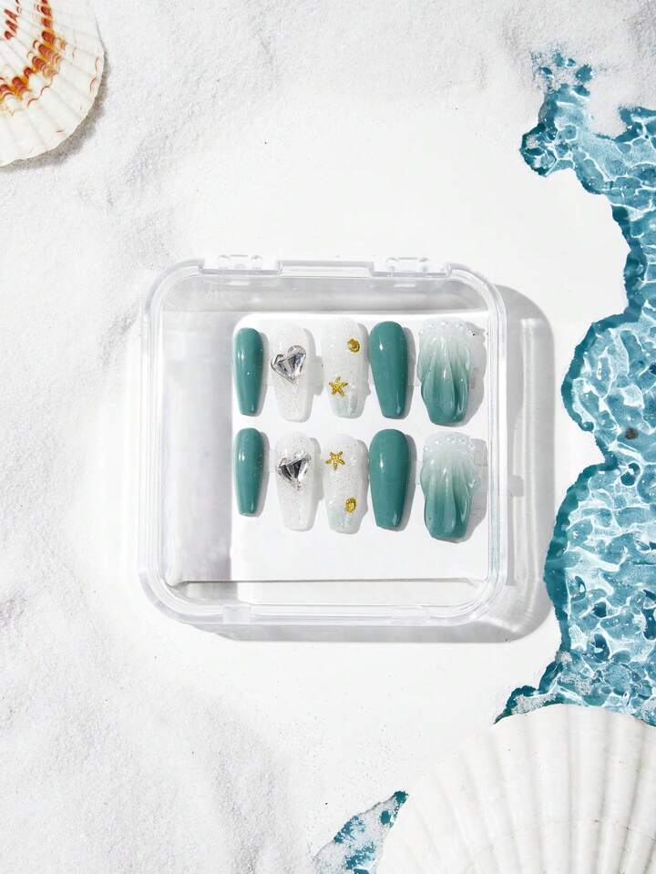Fairycore 10pcs Long Coffin Glitter Heart Decor Fake Nail Kit