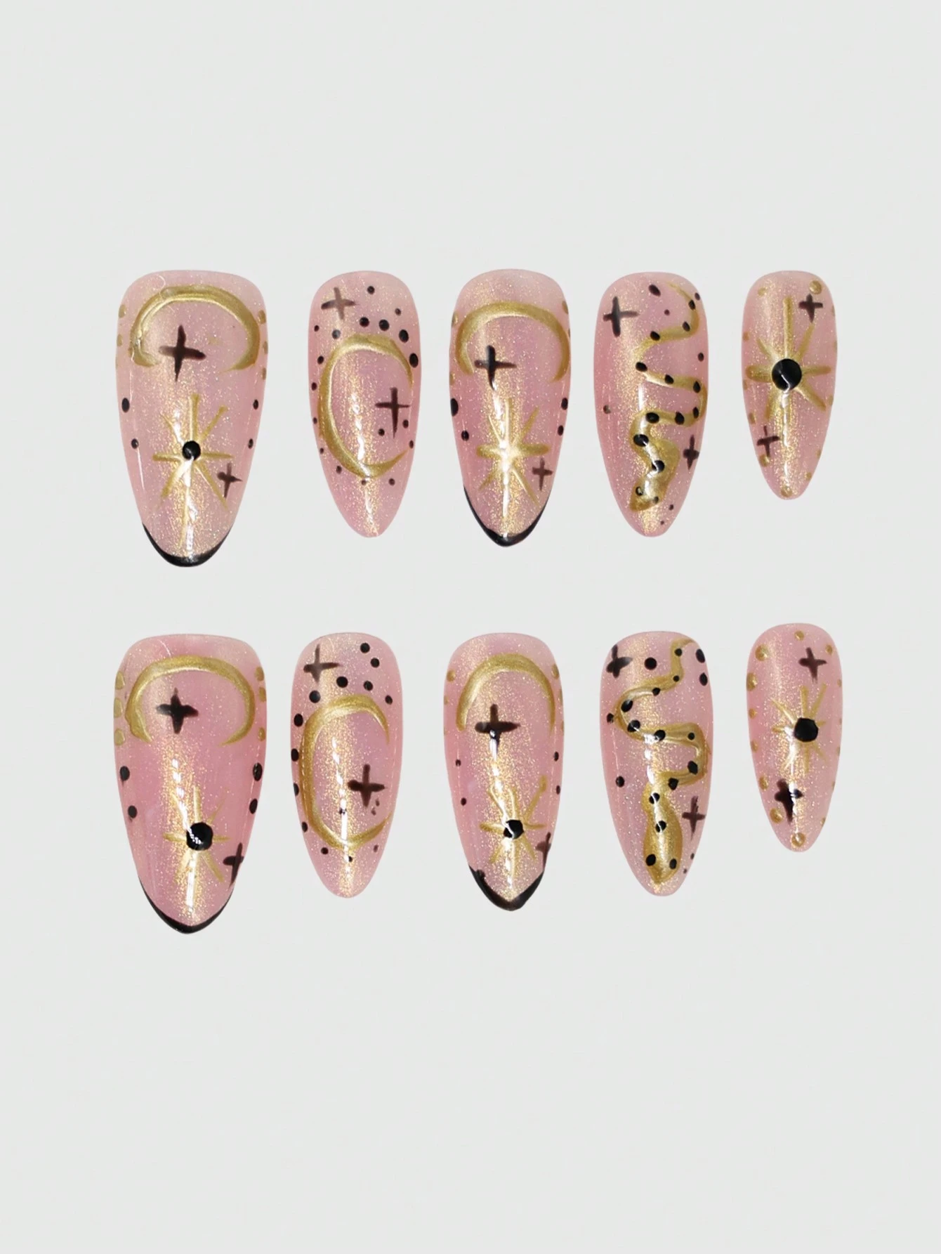 Fairycore 10pcs Luxury Handmade Fake Nails + 3pcs Double-Sided Adhesive, Removable Sun & Moon Nail Art Stickers, High-Quality Shiny Colored Nail Decals Suitable For Holidays, Parties, Dancing And Daily Wear