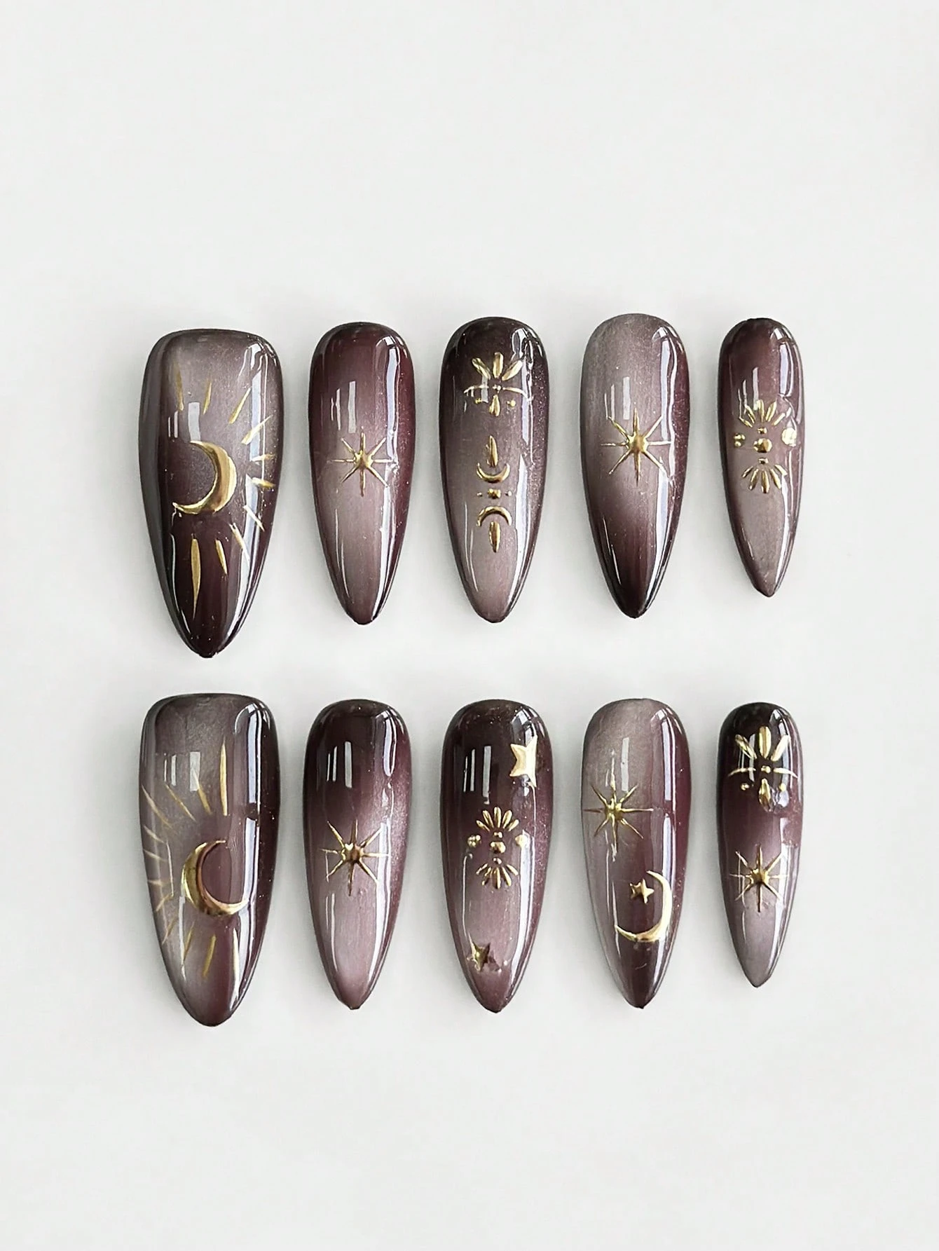 Fairycore 10pcs Sun, Moon & Star Handcraft Press-On Nails + 3pcs Double-Sided Adhesive Tape, Removable Gradient Color Painted Nail Art Decals, High Quality Glossy Cat Eye Colored Manicure, Suitable For Holiday Party, Dance And Daily Wear