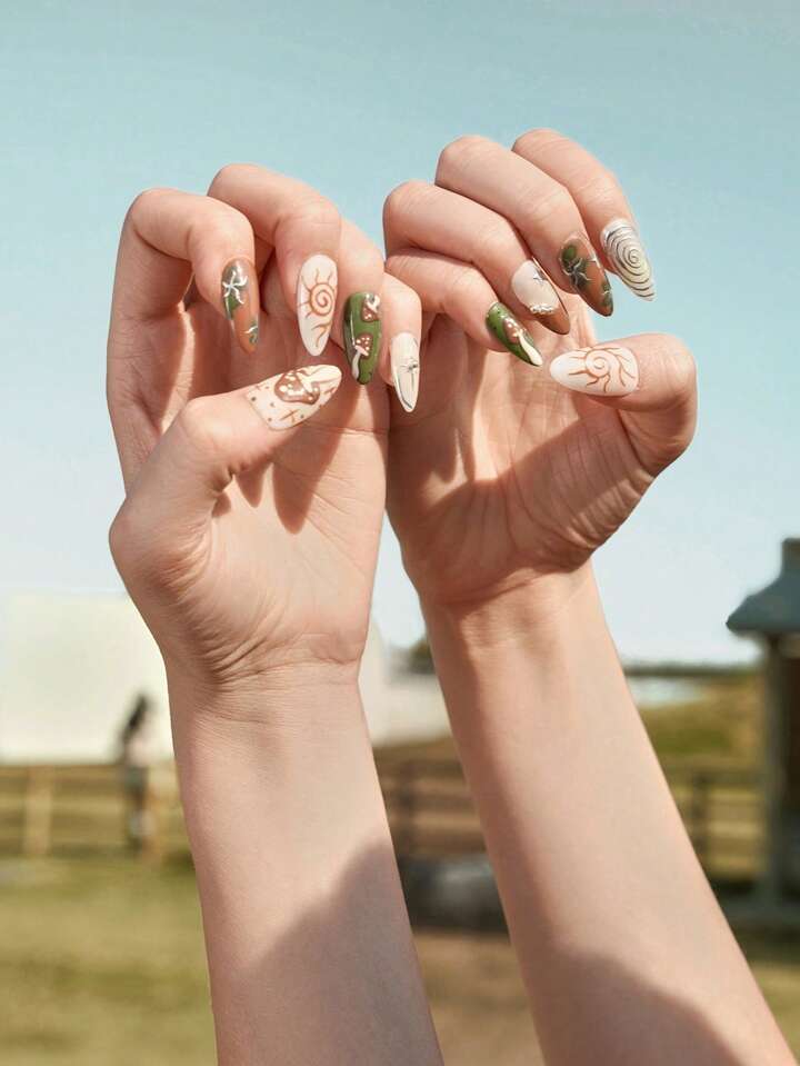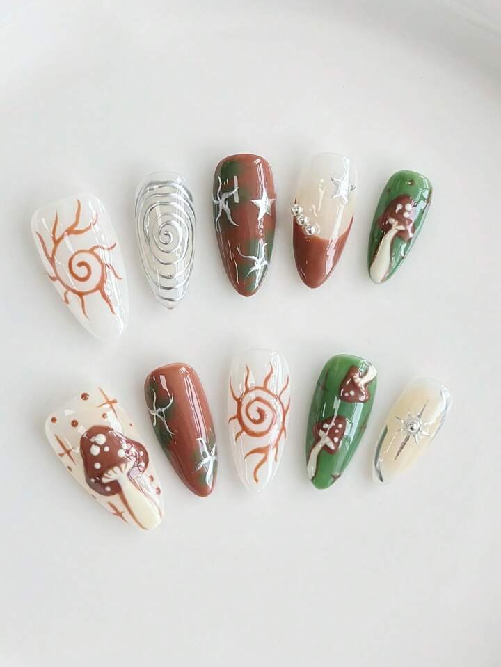 Fairycore 10pcs Y2K Style Sunflower & Mushroom Multicolor Hand-Painted High Quality Press-On Nails + 3 Sheets Double-Sided Adhesive, Removable & Reusable Clash Color Nail Stickers, Suitable For Festivals, Parties, Dancing And Daily Wear