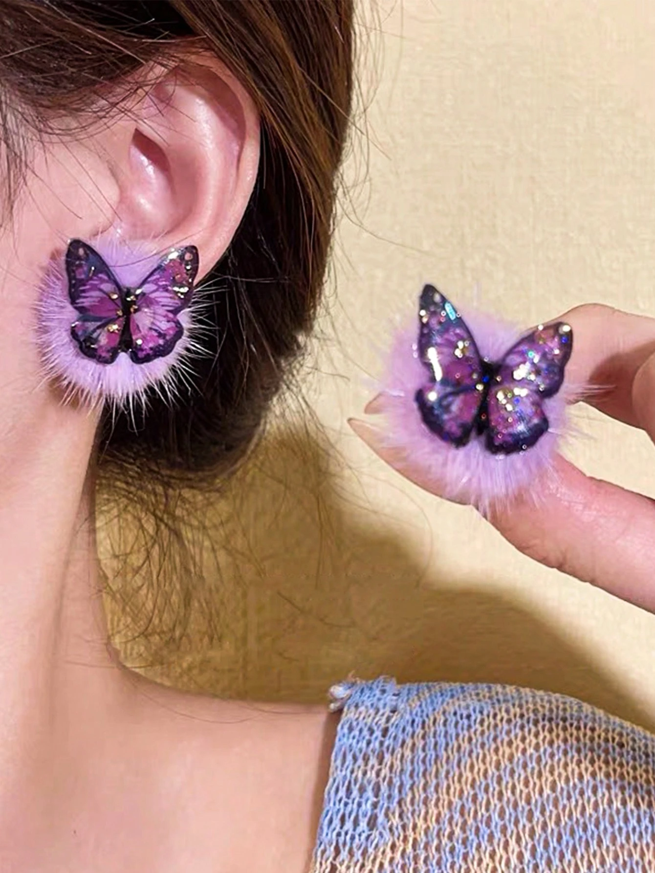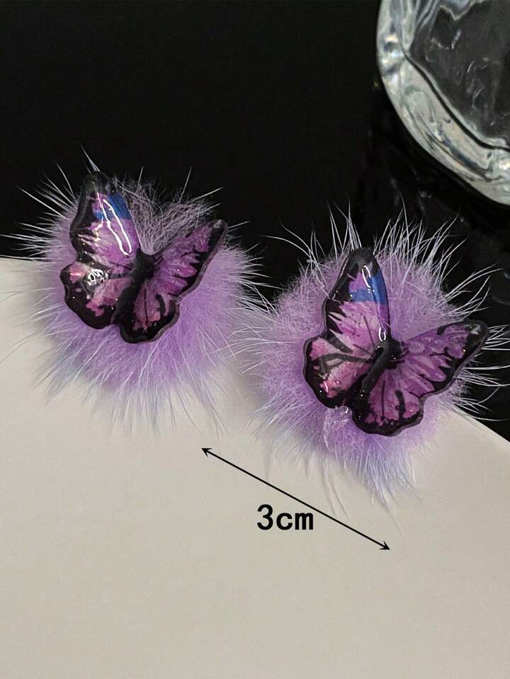 Fairycore 1pair Purple Furry Ball & Butterfly Shaped Stud Earrings