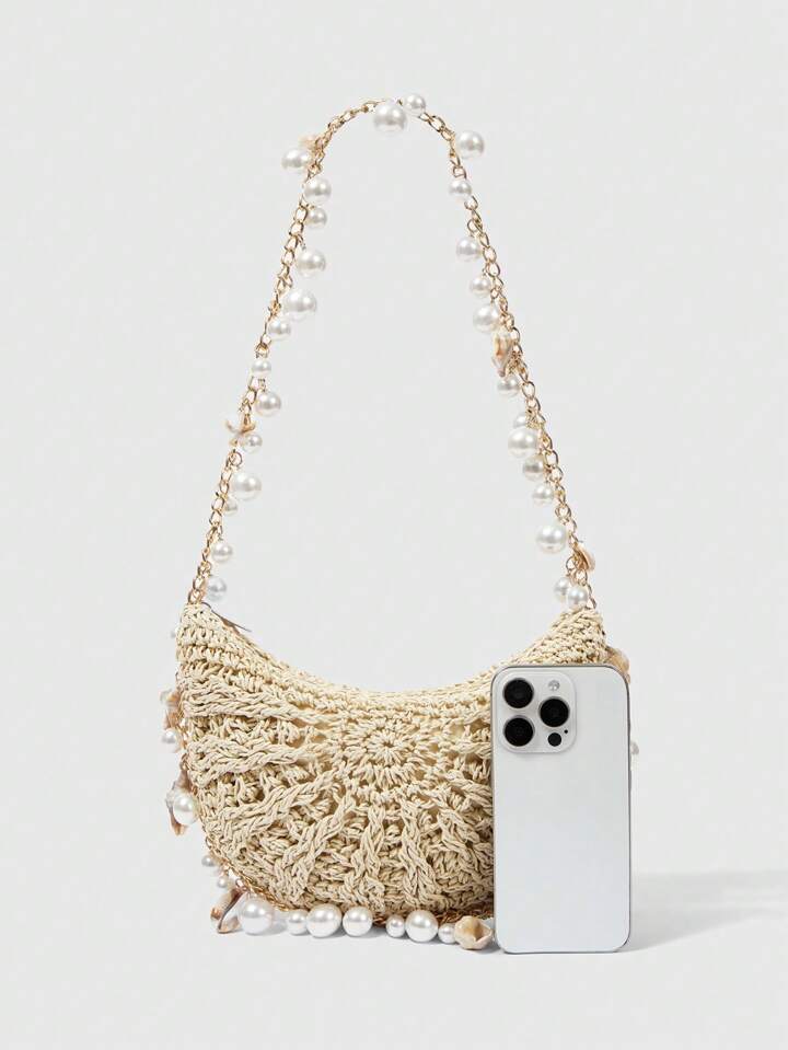Fairycore 1pc Handwoven Semicircle Tote Bag With Sea Decor, Women's Straw Beach Vacation Travel Shoulder Bag (Pearl Shell Position Random)