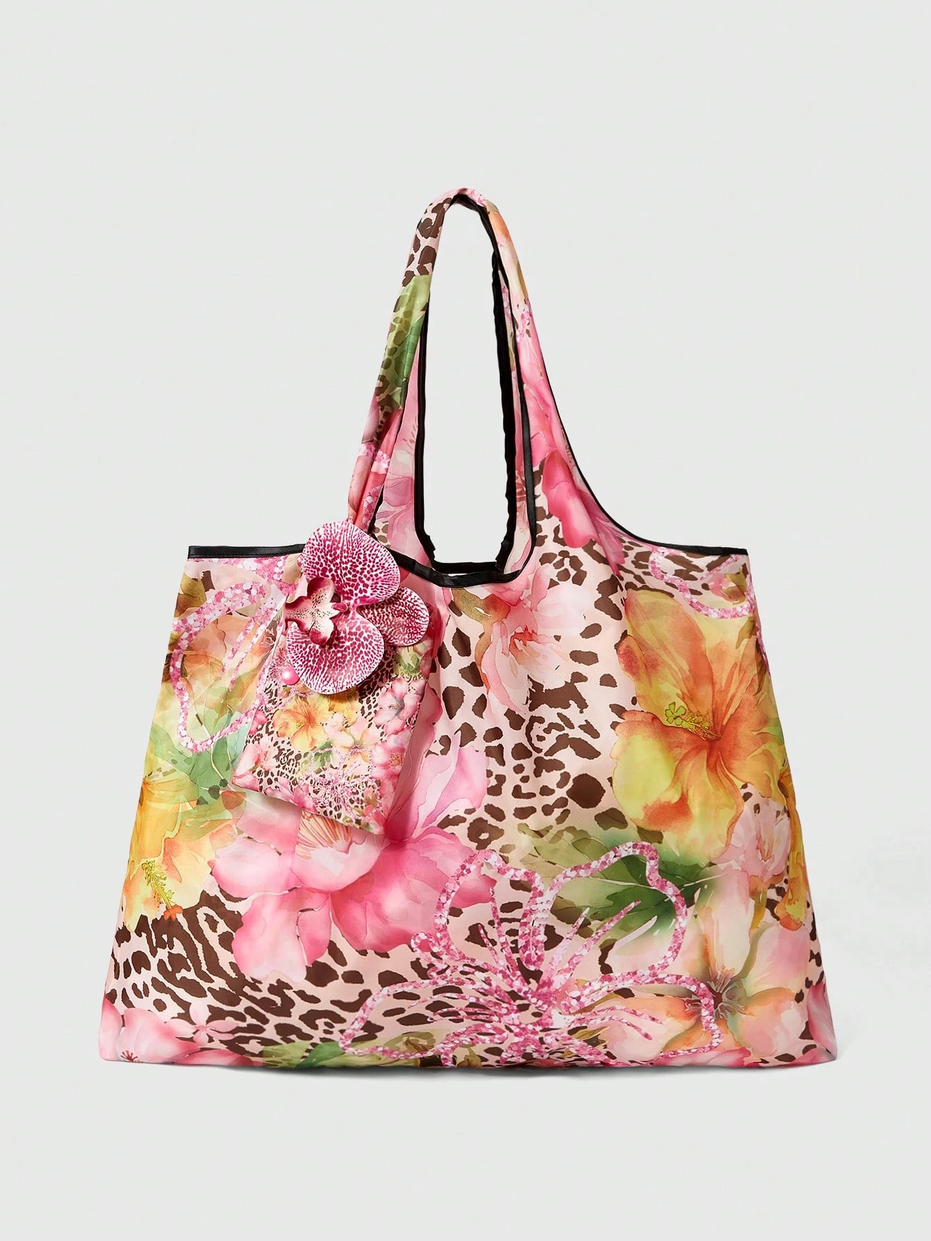 Fairycore 1pc Leopard Print Orchid Foldable Large Capacity Waterproof Shopping Bag, Suitable For Camping, Travel, Shopping, Back To School And Other Occasions