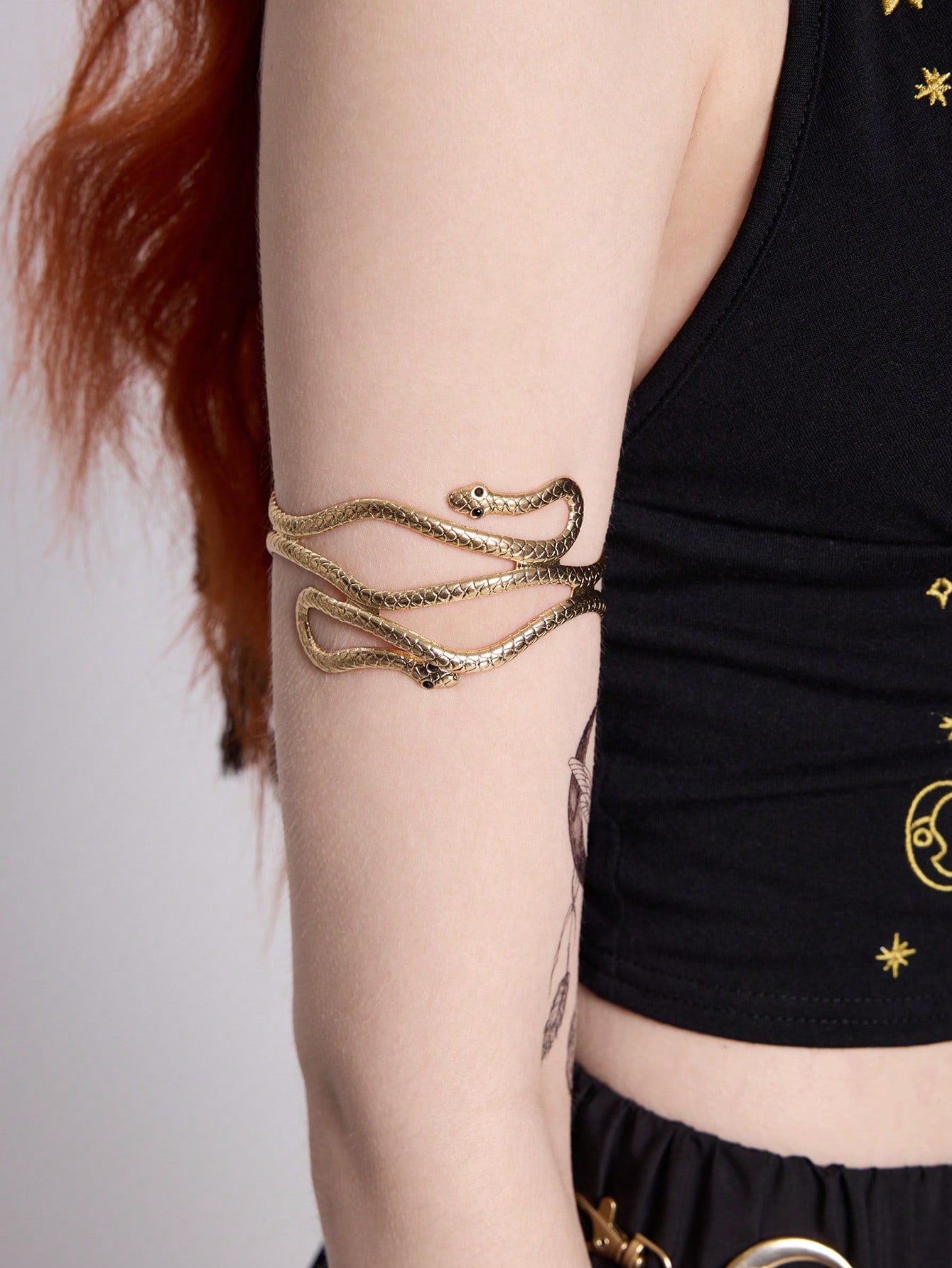 Fairycore 1pc Punk Gold Snake Armband, Hollow Double Head Snake Rhinestone Decorated Bracelet, Exaggerated Open Cuff Bangle